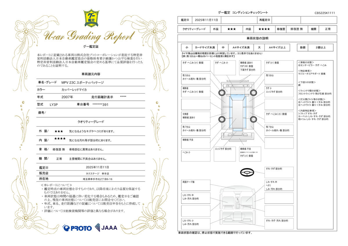 | 保証項目 | 3ヶ月・3000km以内ならエンジン、トランスミッション、ハイブリッド、ステアリング、ブレーキの各機構における主要項目を無償修理(または交換)いたします。 |