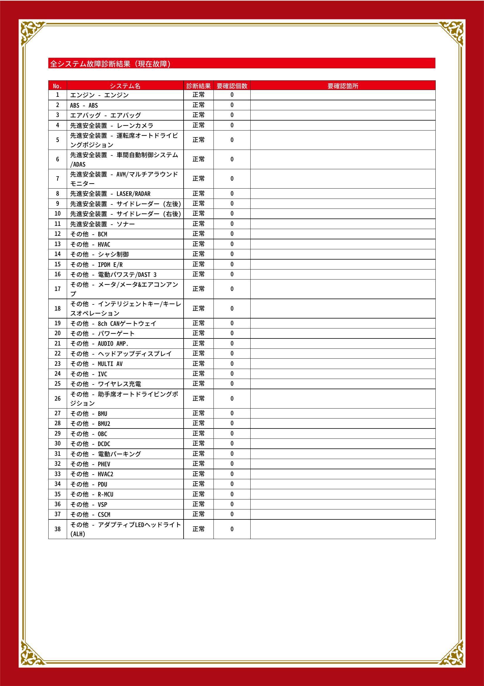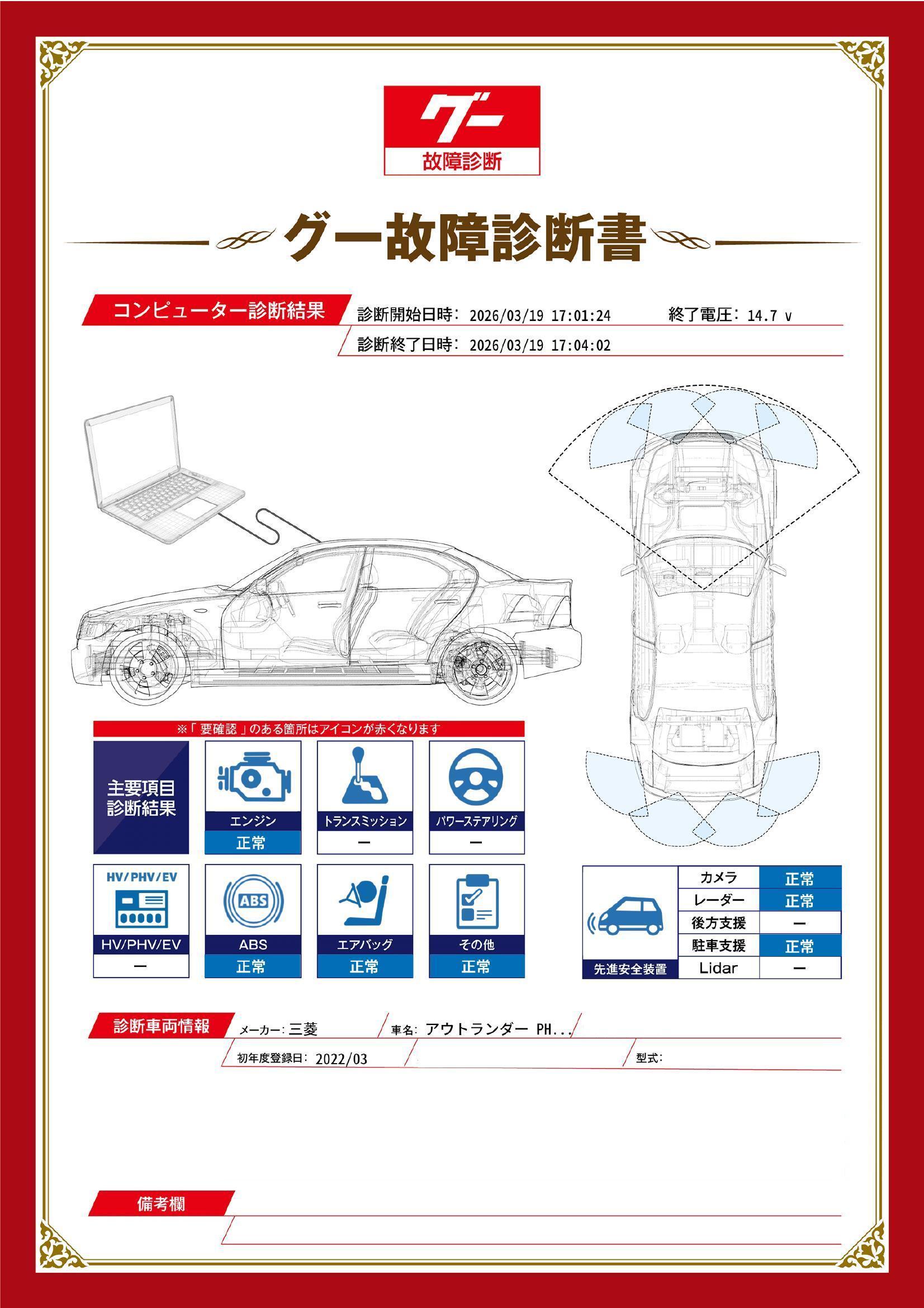 | 保証項目 | 3ヶ月・3000km以内ならエンジン、トランスミッション、ハイブリッド、ステアリング、ブレーキの各機構における主要項目を無償修理(または交換)いたします。 |