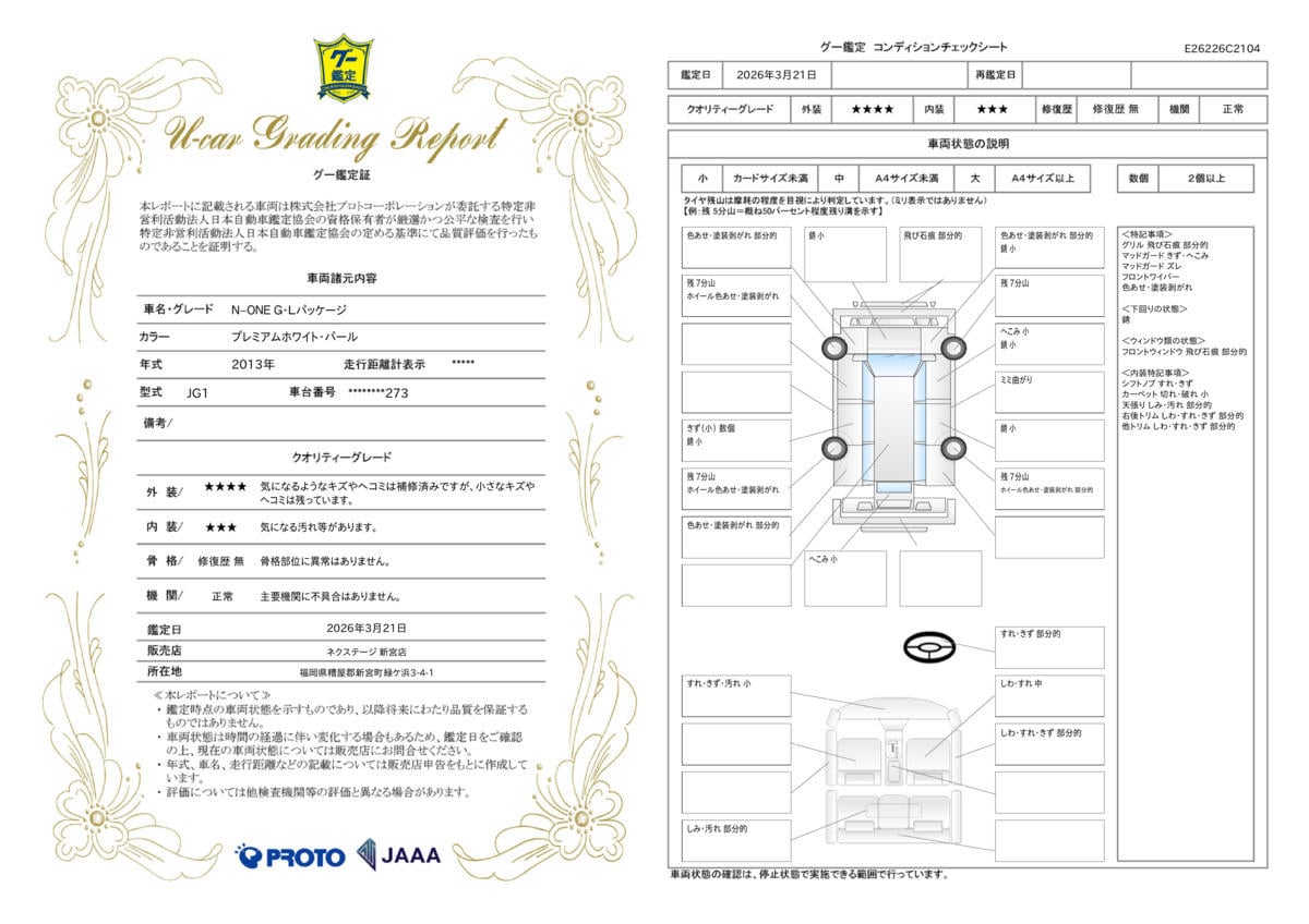 | 保証項目 | 3ヶ月・3000km以内ならエンジン、トランスミッション、ハイブリッド、ステアリング、ブレーキの各機構における主要項目を無償修理(または交換)いたします。 |