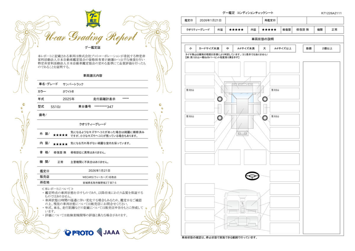 | 保証項目 | 納車後1ヶ月・1000km以内は36機構・343項目を保証いたします。詳しくは販売店までお問い合わせ下さい。 |
