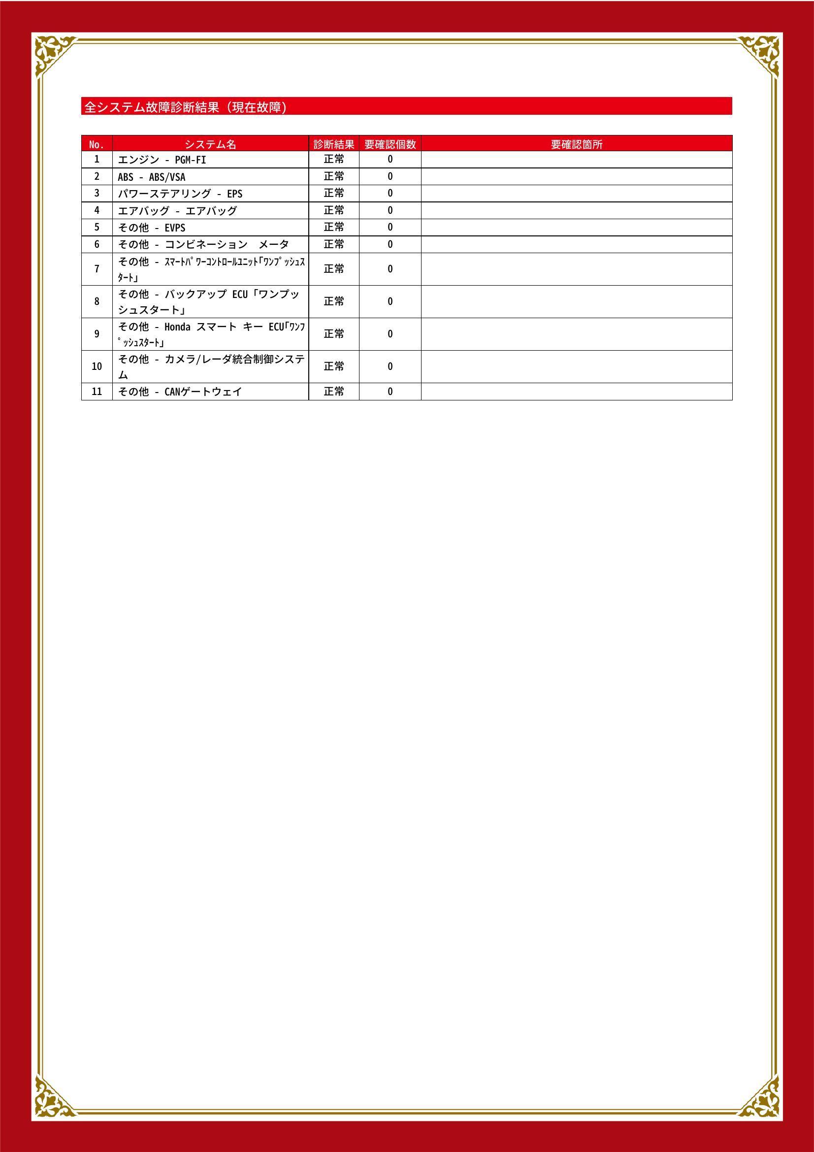 | 保証項目 | 3ヶ月・3000km以内ならエンジン、トランスミッション、ハイブリッド、ステアリング、ブレーキの各機構における主要項目を無償修理(または交換)いたします。 |
