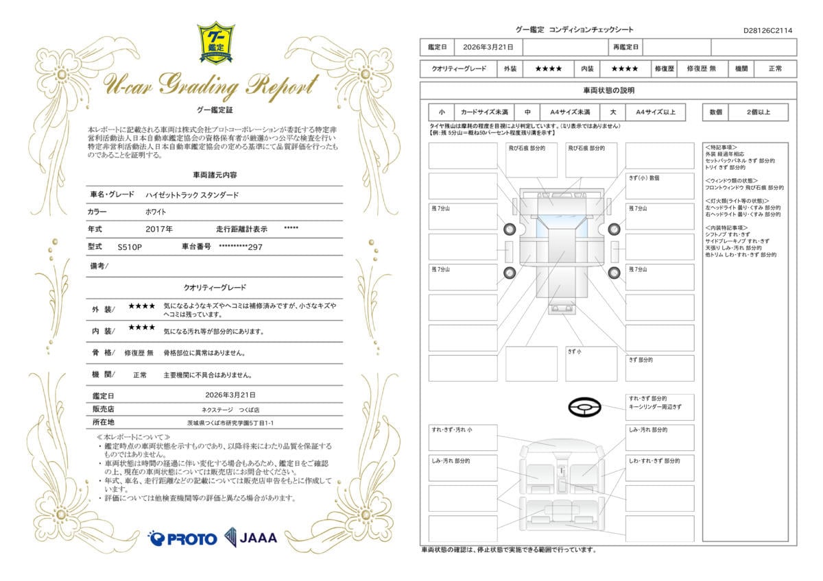 | 保証項目 | 3ヶ月・3000km以内ならエンジン、トランスミッション、ハイブリッド、ステアリング、ブレーキの各機構における主要項目を無償修理(または交換)いたします。 |