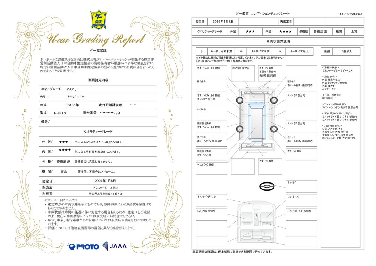 | 保証項目 | 3ヶ月・3000km以内ならエンジン、トランスミッション、ハイブリッド、ステアリング、ブレーキの各機構における主要項目を無償修理(または交換)いたします。 |