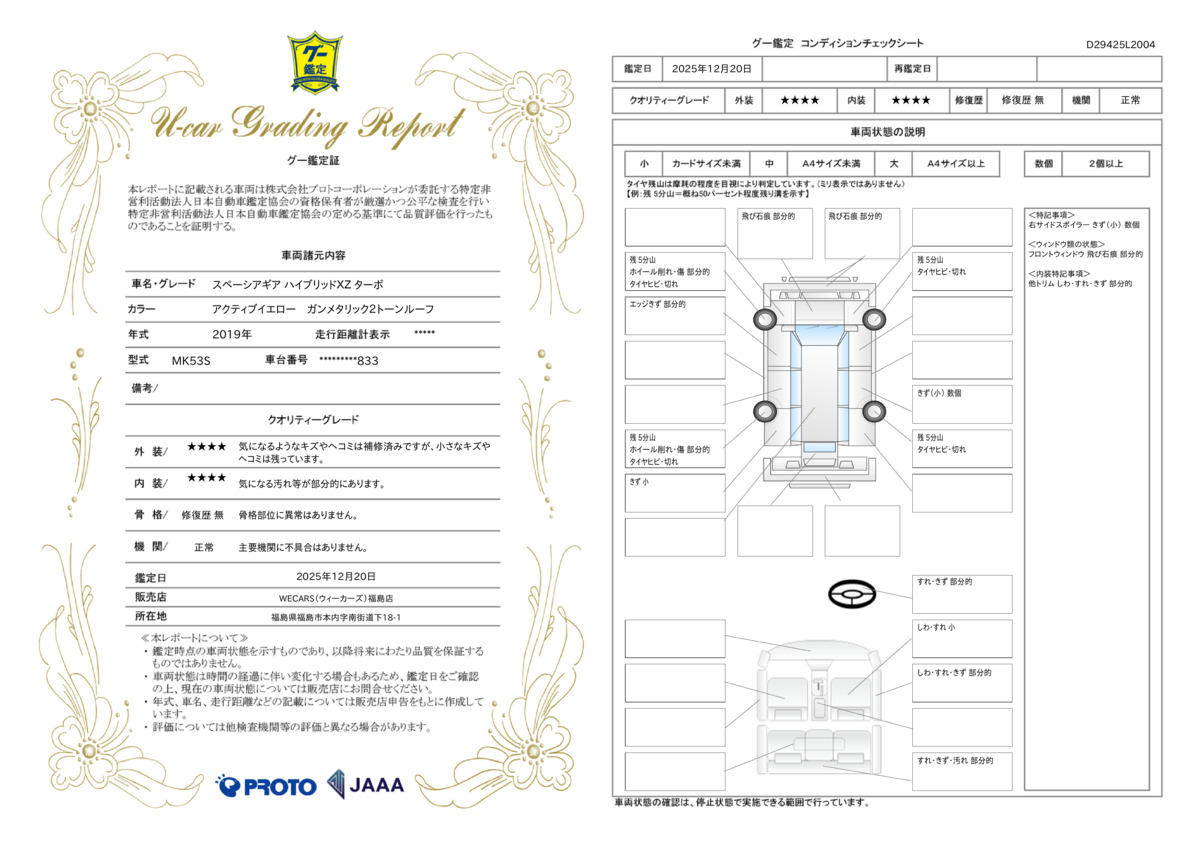 [保証付]:1ヶ月・1000km ※いずれか早い時期が保証適用の条件となります。 納車後1ヶ月・1000km以内は36機構・343項目を保証いたします。詳しくは販売店までお問い合わせ下さい。 |