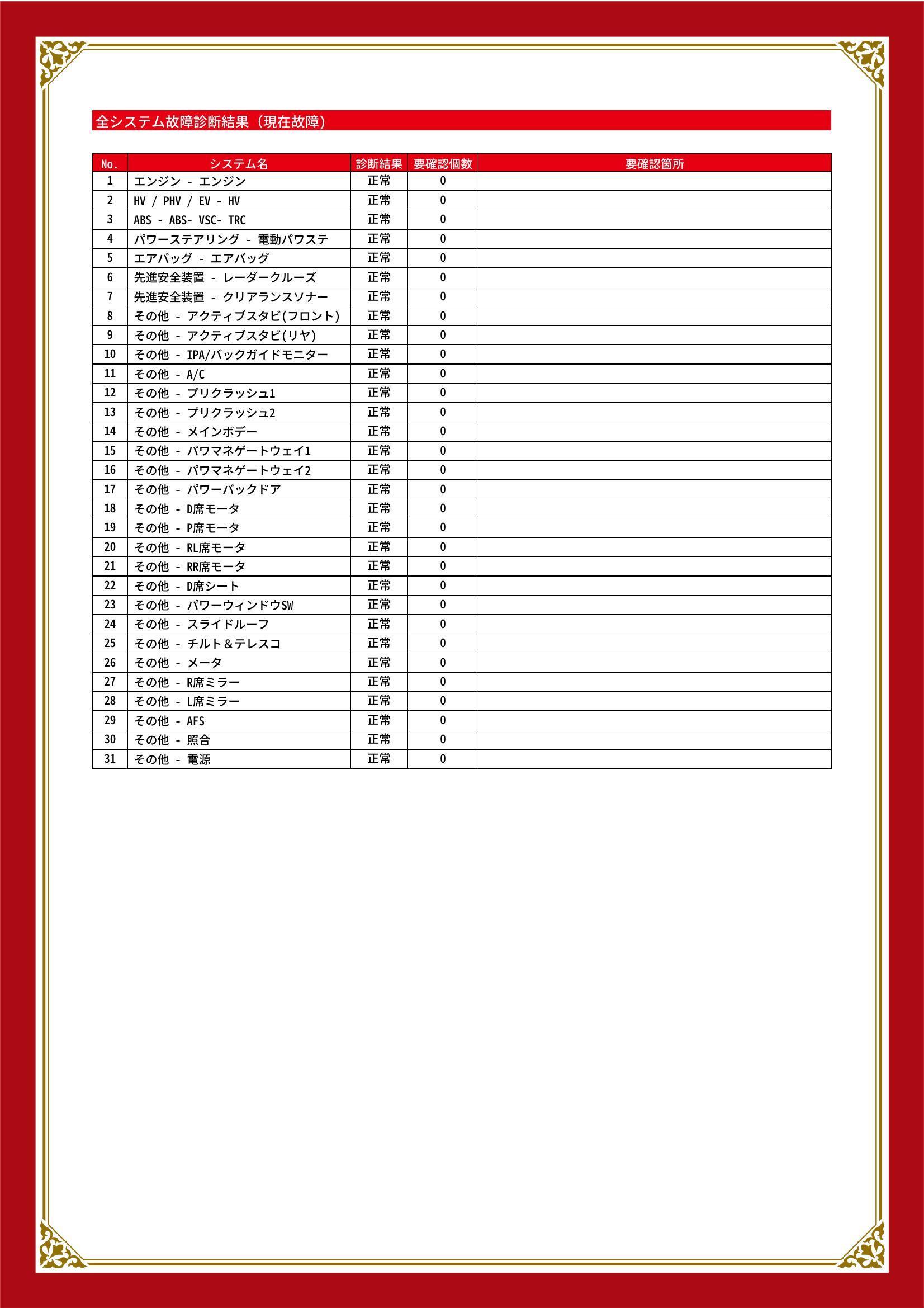 | 保証項目 | 3ヶ月・3000km以内ならエンジン、トランスミッション、ハイブリッド、ステアリング、ブレーキの各機構における主要項目を無償修理(または交換)いたします。 |