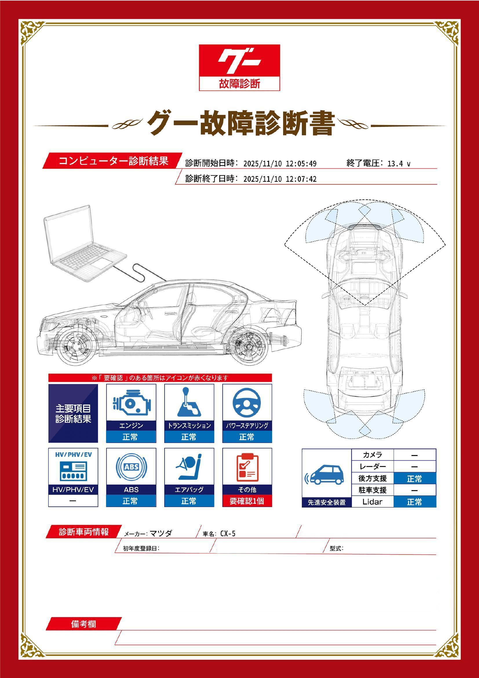 | 保証項目 | 3ヶ月・3000km以内ならエンジン、トランスミッション、ハイブリッド、ステアリング、ブレーキの各機構における主要項目を無償修理(または交換)いたします。 |