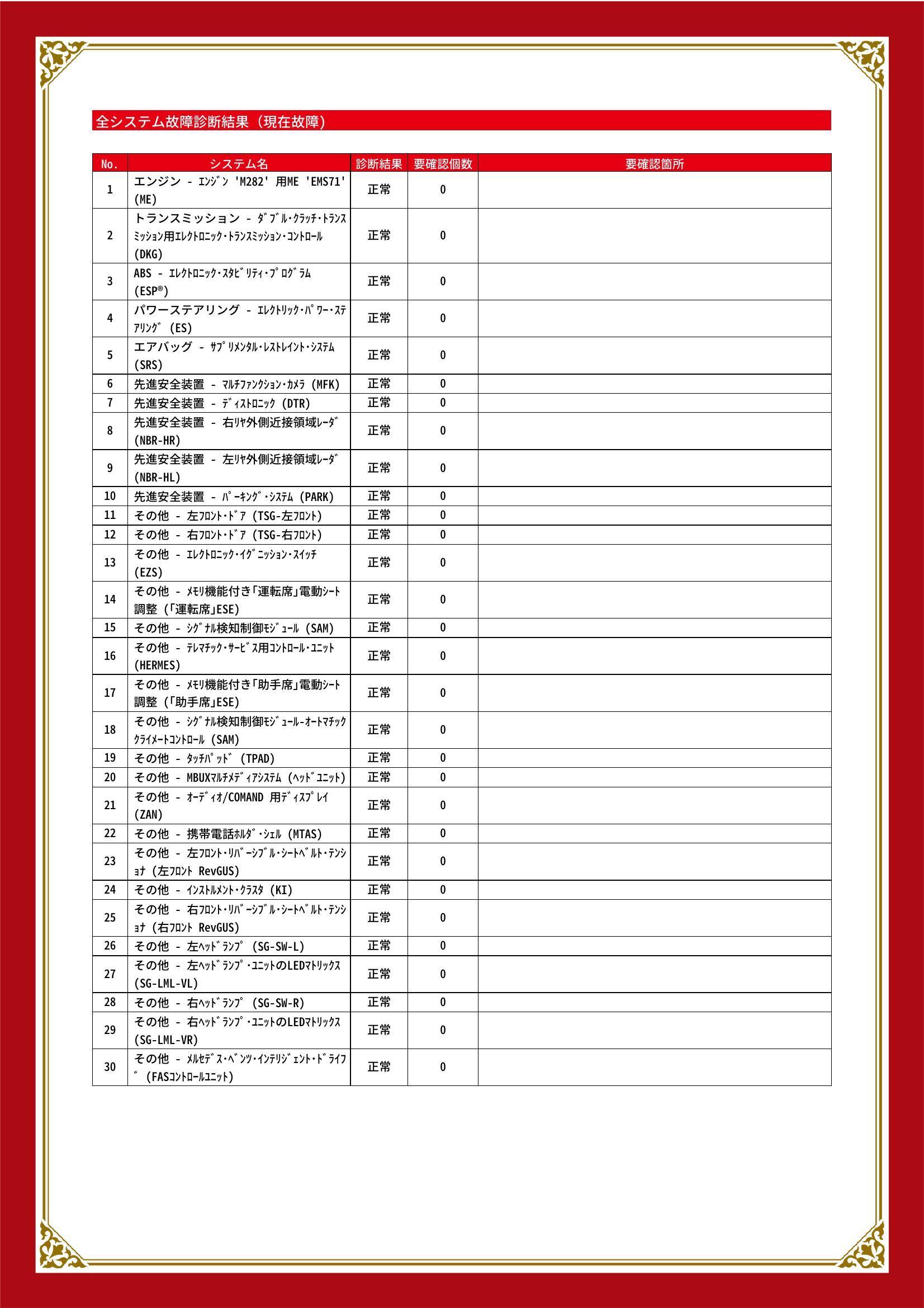 計238項目 有償にて保証期間の長い1年間のEGSスタンダード保証(137項目)、充実内容のEGSプレミアム保証(238項目)もご選択頂けます。遠方のお客様も充実な保証内容で安心安全なカーライフをお楽しみ頂けます。 |