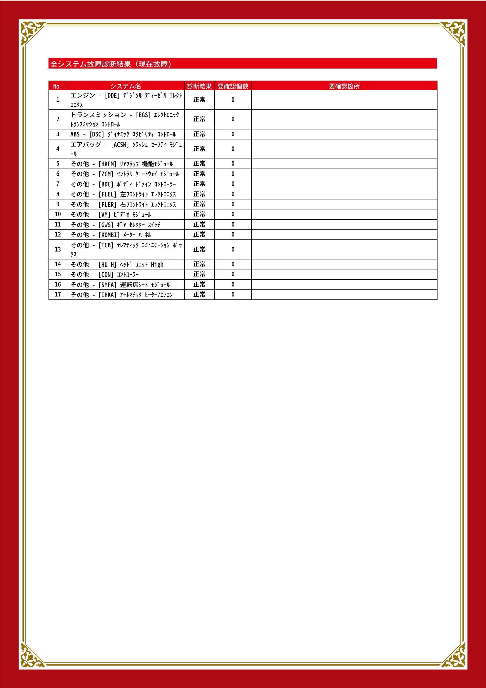 | 保証項目 | 1ヶ月以内なら走行距離無制限にてエンジン、トランスミッション、ハイブリッド、ステアリング、ブレーキの各機構における主要項目を無償修理(または交換)いたします。 |