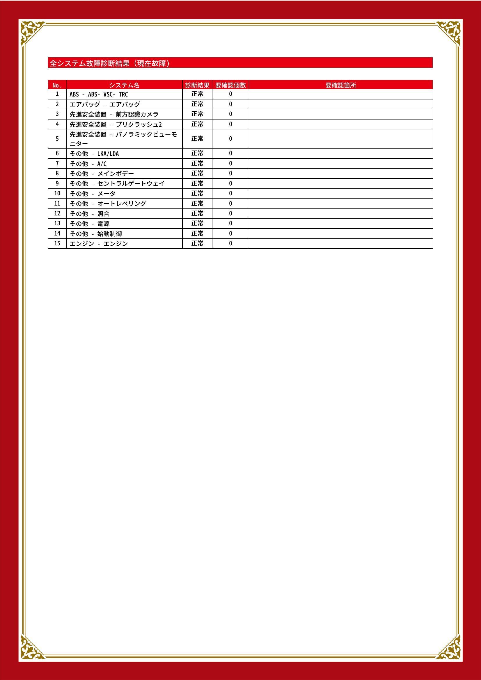 | 保証項目 | 3ヶ月・3000km以内ならエンジン、トランスミッション、ハイブリッド、ステアリング、ブレーキの各機構における主要項目を無償修理(または交換)いたします。 |