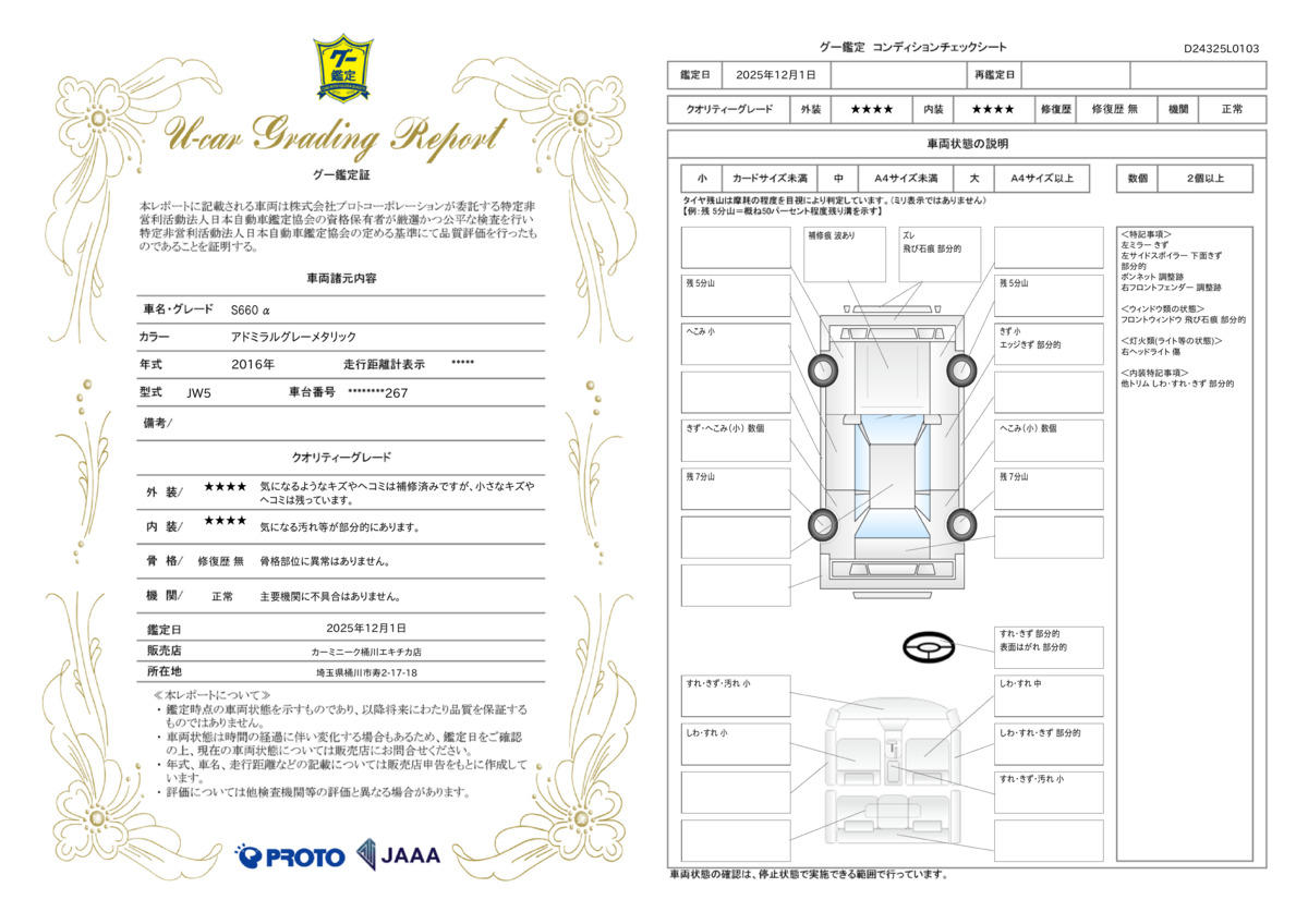 計600項目 社外品、消耗品、内外装のキズ等を除く、およそ600項目の部位が対象です。詳しくはスタッフまでご確認ください。 |