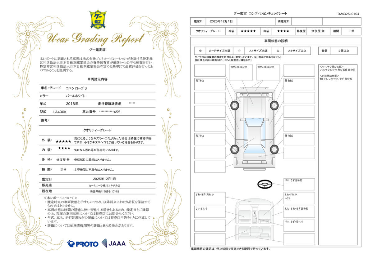 計600項目 社外品、消耗品、内外装のキズ等を除く、およそ600項目の部位が対象です。詳しくはスタッフまでご確認ください。 |
