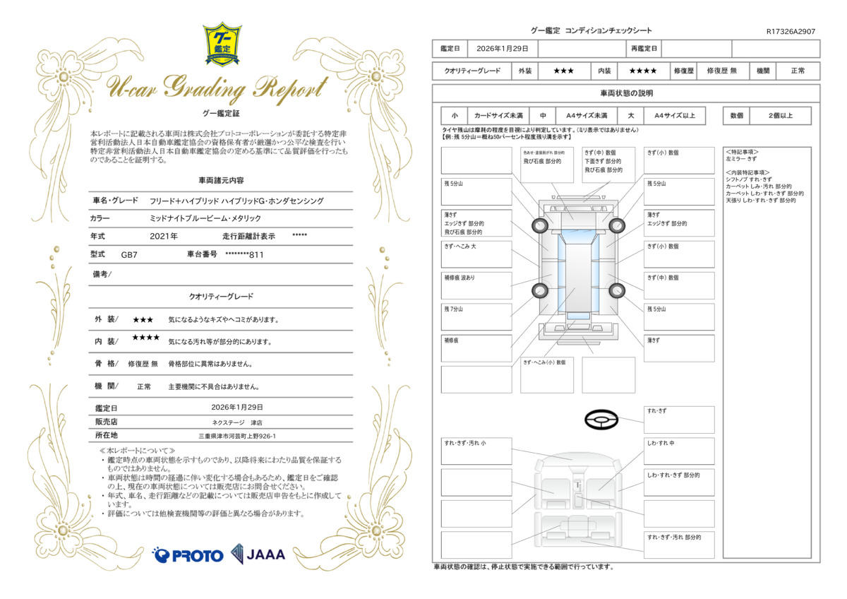 | 保証項目 | 3ヶ月・3000km以内ならエンジン、トランスミッション、ハイブリッド、ステアリング、ブレーキの各機構における主要項目を無償修理(または交換)いたします。 |