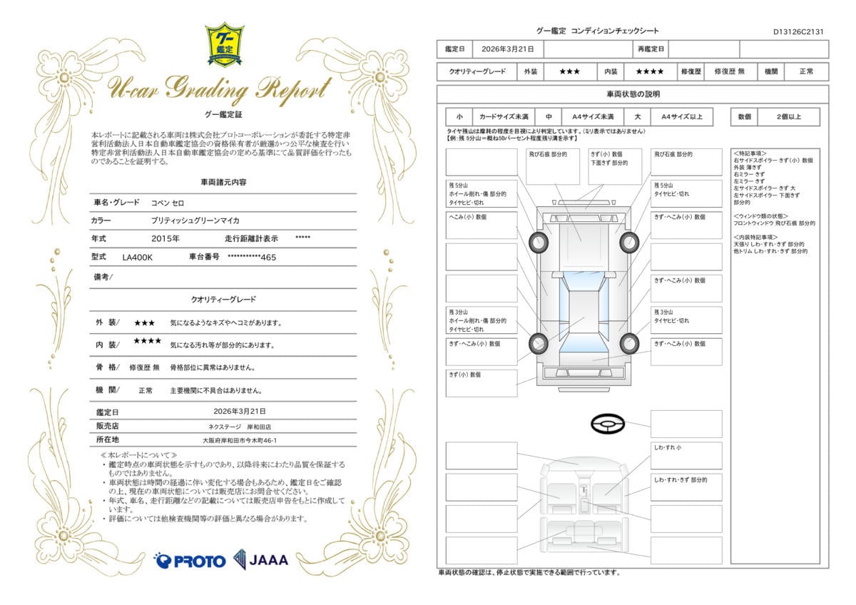 弊社では、全車『修復歴なし』のお車のみ取り扱っております。専任バイヤーによる厳選した仕入れの後、入庫後の車両チェックを行い、ネクステージが認定した高品質な中古車をご提供しております。 14