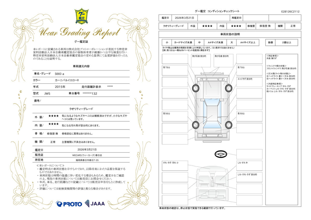 | 保証項目 | 納車後1ヶ月・1000km以内は36機構・343項目を保証いたします。詳しくは販売店までお問い合わせ下さい。 |