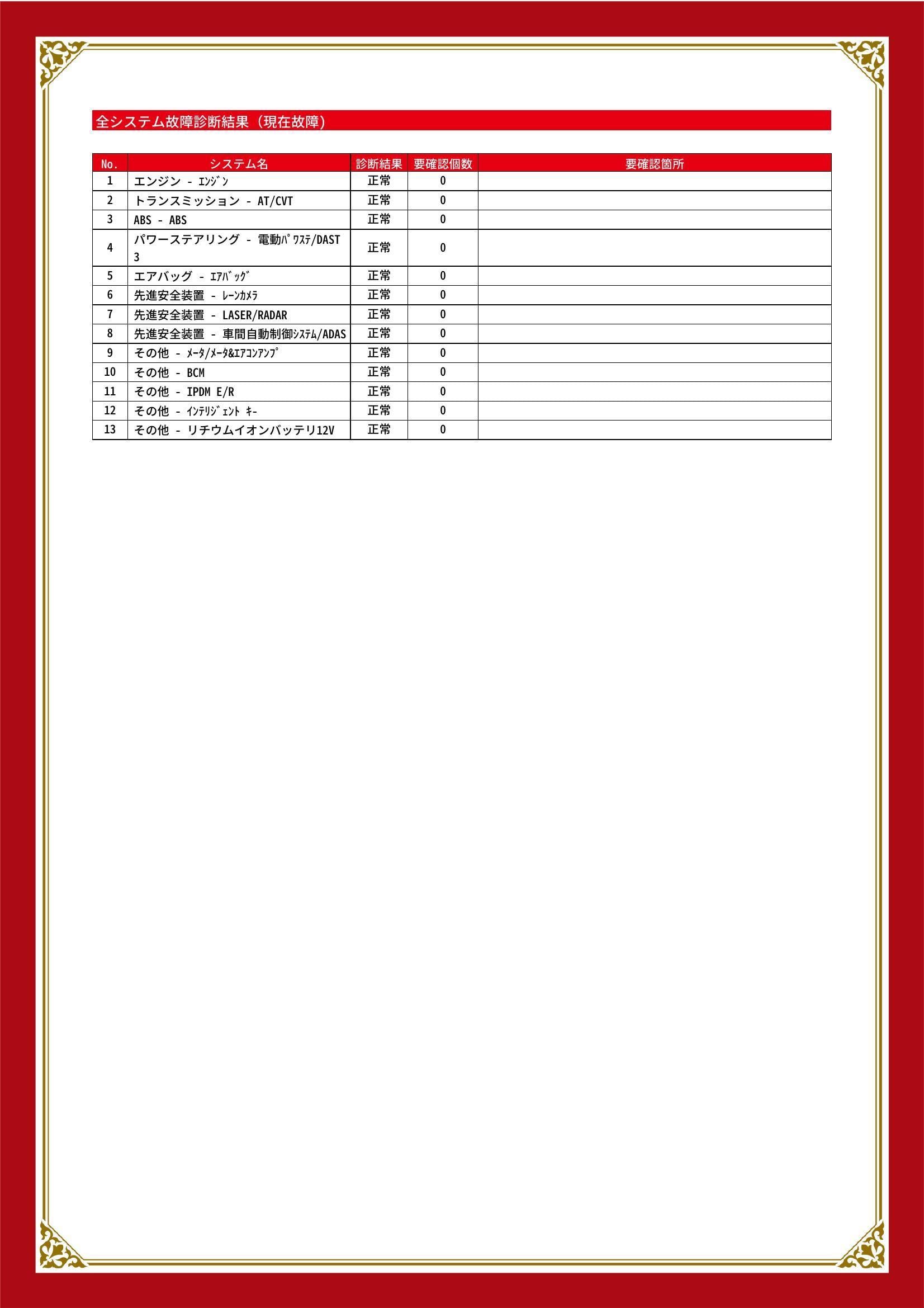 | 保証項目 | 納車後1ヶ月・1000km以内は36機構・343項目を保証いたします。詳しくは販売店までお問い合わせ下さい。 |