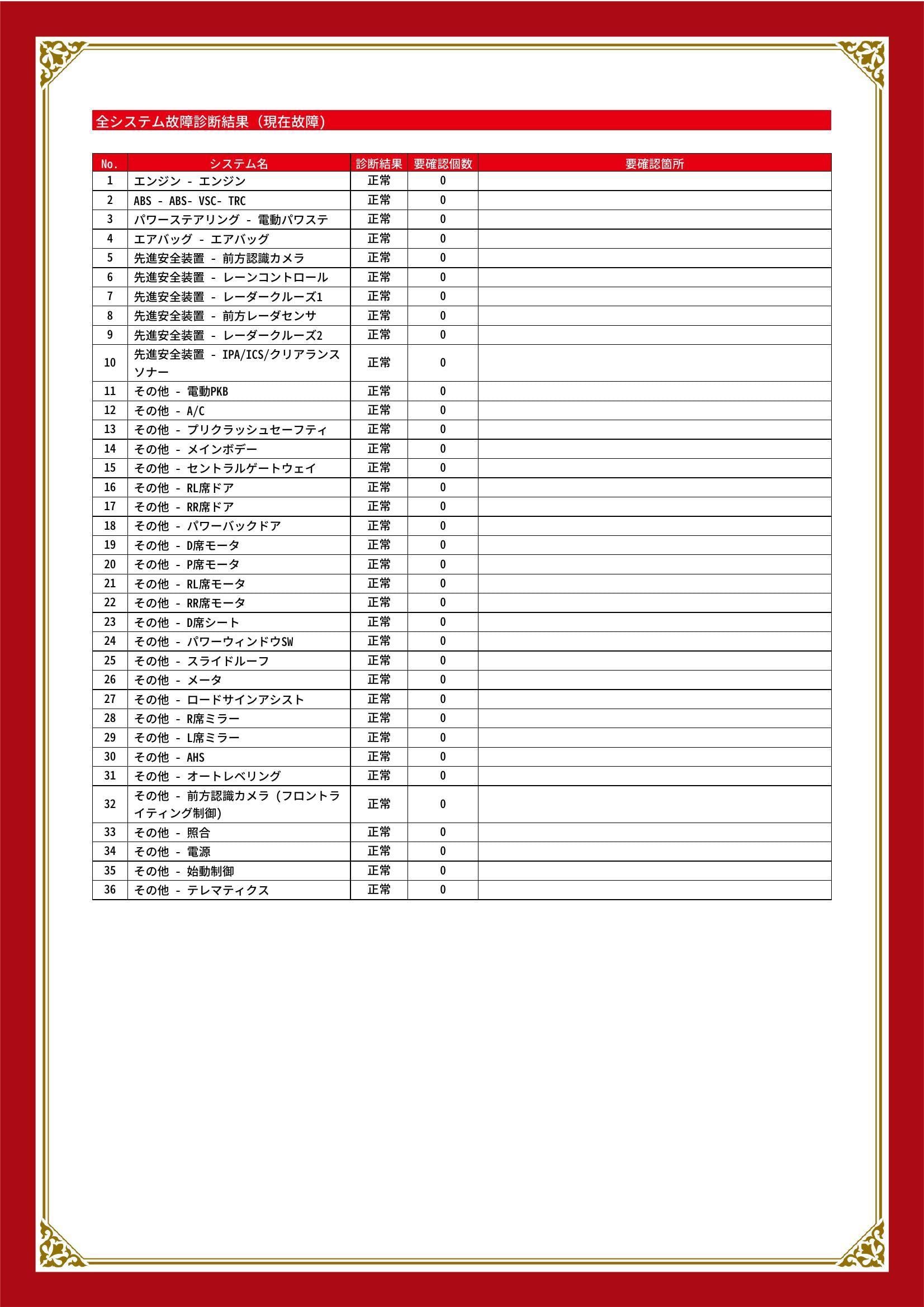 | 保証項目 | 3ヶ月・3000km以内ならエンジン、トランスミッション、ハイブリッド、ステアリング、ブレーキの各機構における主要項目を無償修理(または交換)いたします。 |