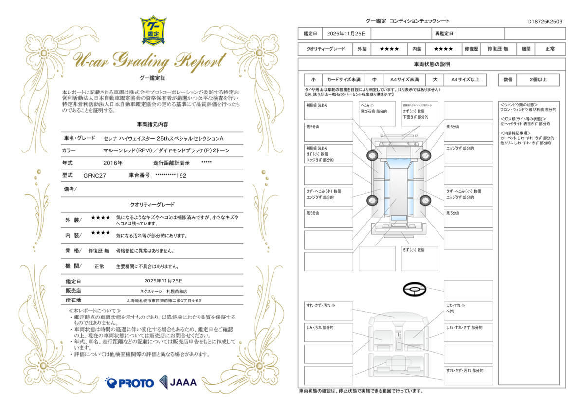 弊社では、全車『修復歴なし』のお車のみ取り扱っております。専任バイヤーによる厳選した仕入れの後、入庫後の車両チェックを行い、ネクステージが認定した高品質な中古車をご提供しております。 16
