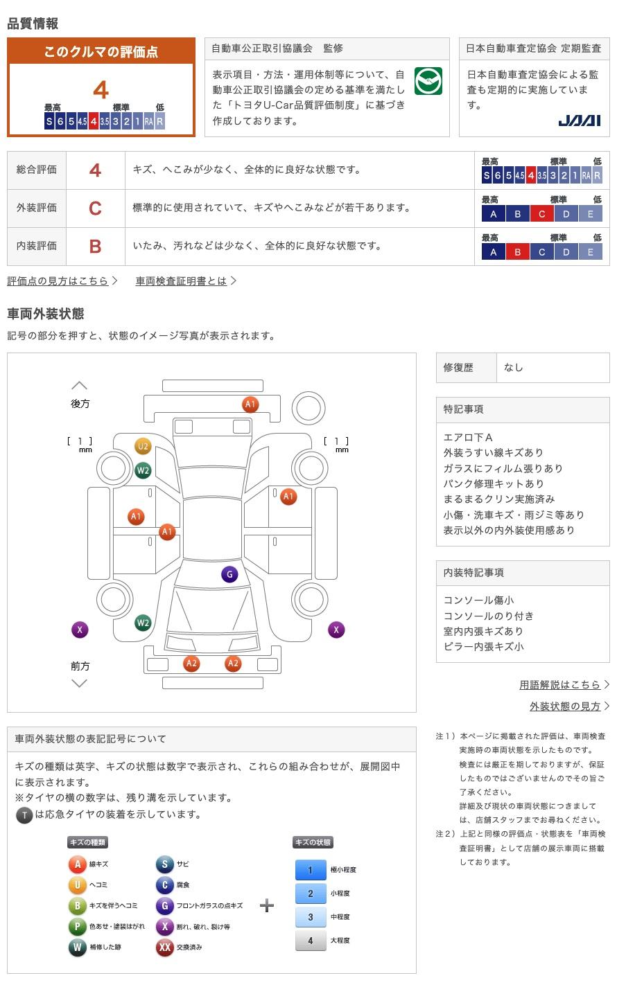 店頭にて、クルマの状態が一目で分かる検査証明書を公開中。トヨタ認定検査員が厳しく査定し、状態を点数と図解で表示しています。修復歴はもちろん、傷やヘコミの箇所や程度がご確認いただけます。 3