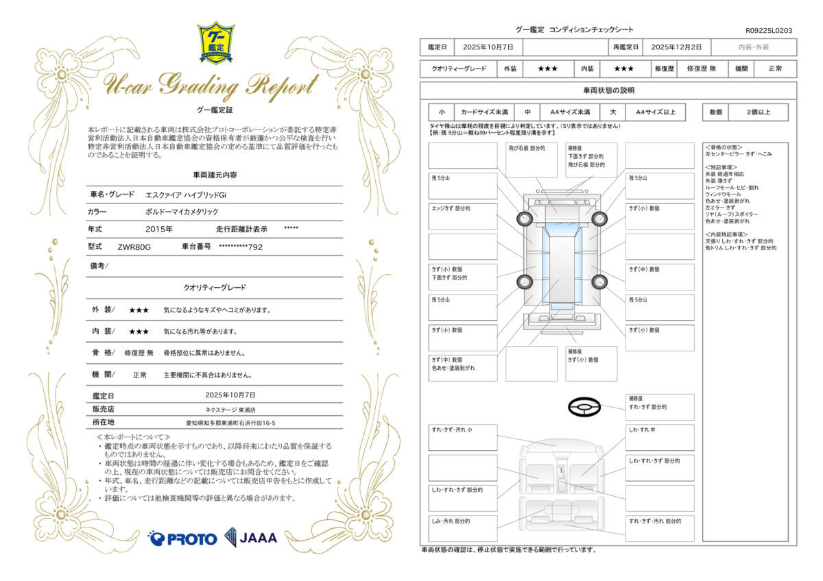 | 保証項目 | 3ヶ月・3000km以内ならエンジン、トランスミッション、ハイブリッド、ステアリング、ブレーキの各機構における主要項目を無償修理(または交換)いたします。 |