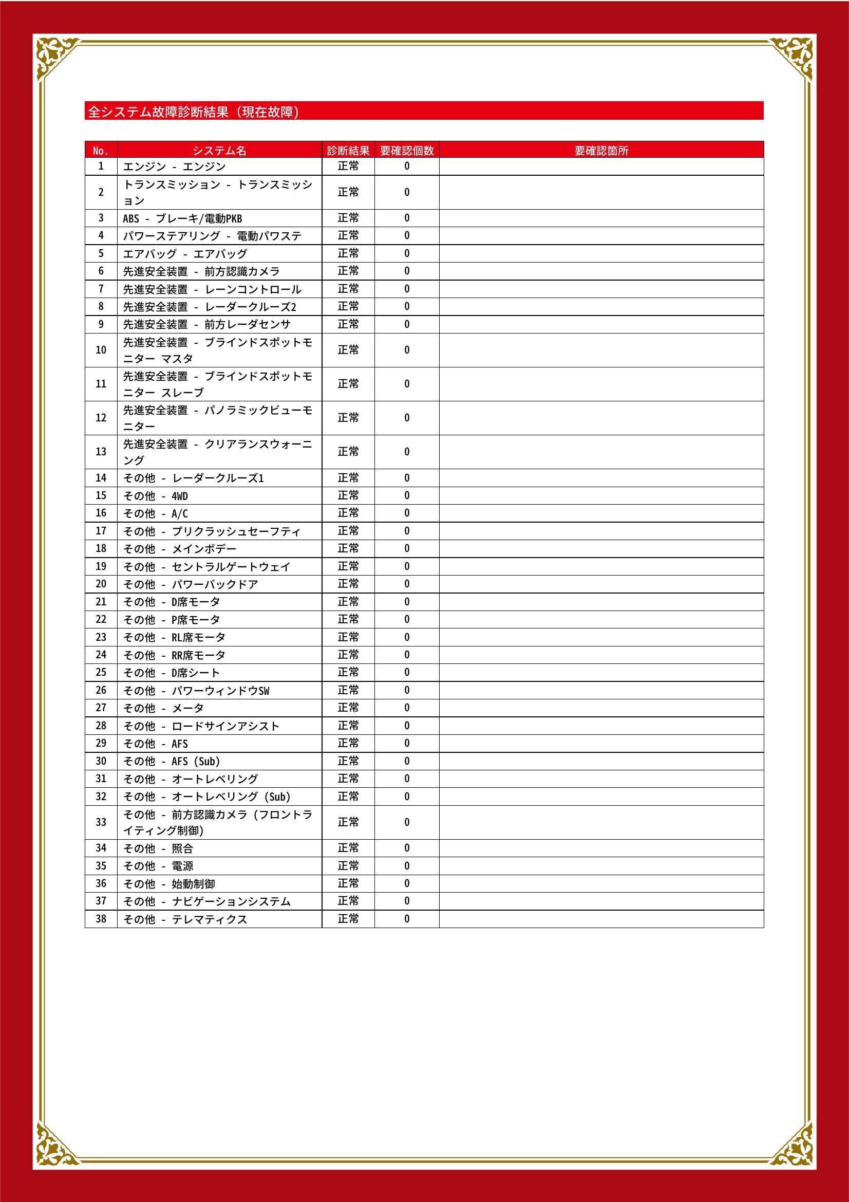 | 保証項目 | 3ヶ月・3000km以内ならエンジン、トランスミッション、ハイブリッド、ステアリング、ブレーキの各機構における主要項目を無償修理(または交換)いたします。 |