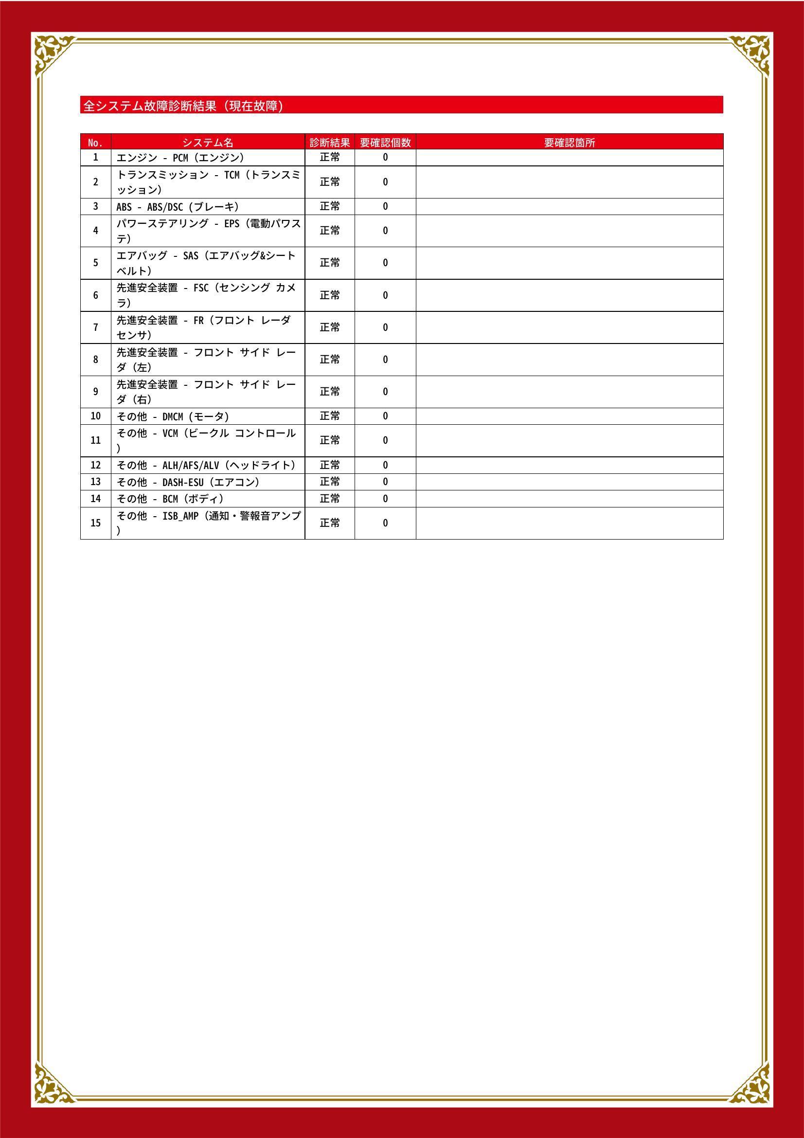 | 保証項目 | 3ヶ月・3000km以内ならエンジン、トランスミッション、ハイブリッド、ステアリング、ブレーキの各機構における主要項目を無償修理(または交換)いたします。 |