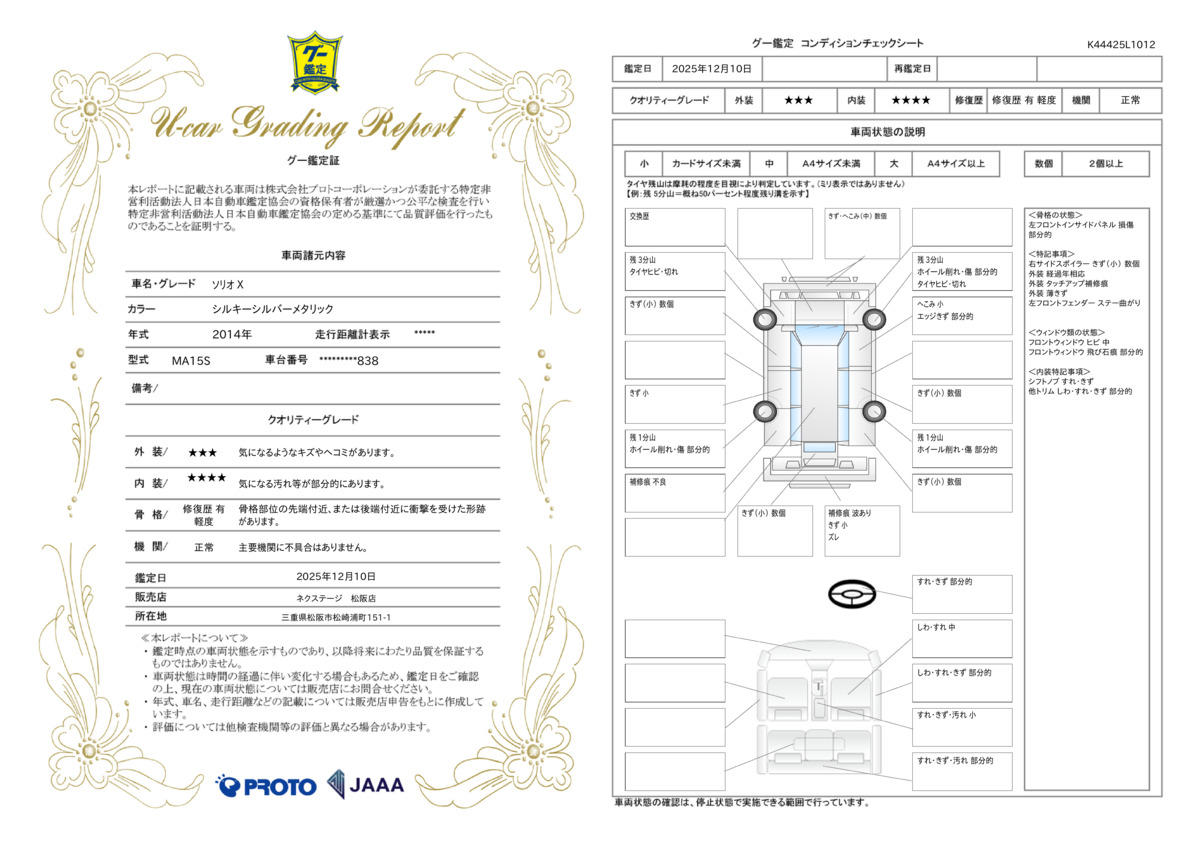 弊社では、全車『修復歴なし』のお車のみ取り扱っております。専任バイヤーによる厳選した仕入れの後、入庫後の車両チェックを行い、ネクステージが認定した高品質な中古車をご提供しております。 15