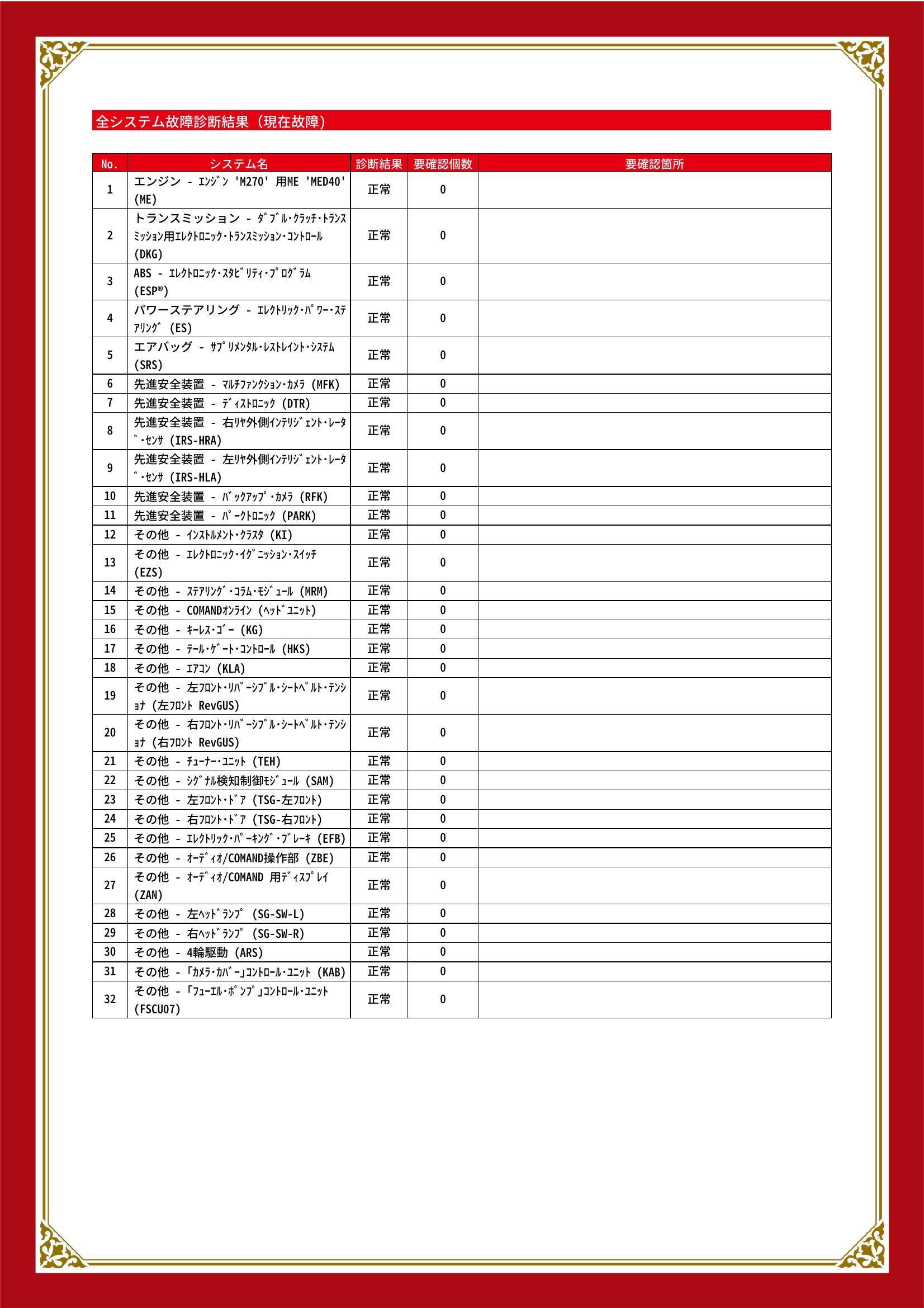 | 保証項目 | 1ヶ月以内なら走行距離無制限にてエンジン、トランスミッション、ハイブリッド、ステアリング、ブレーキの各機構における主要項目を無償修理(または交換)いたします。 |
