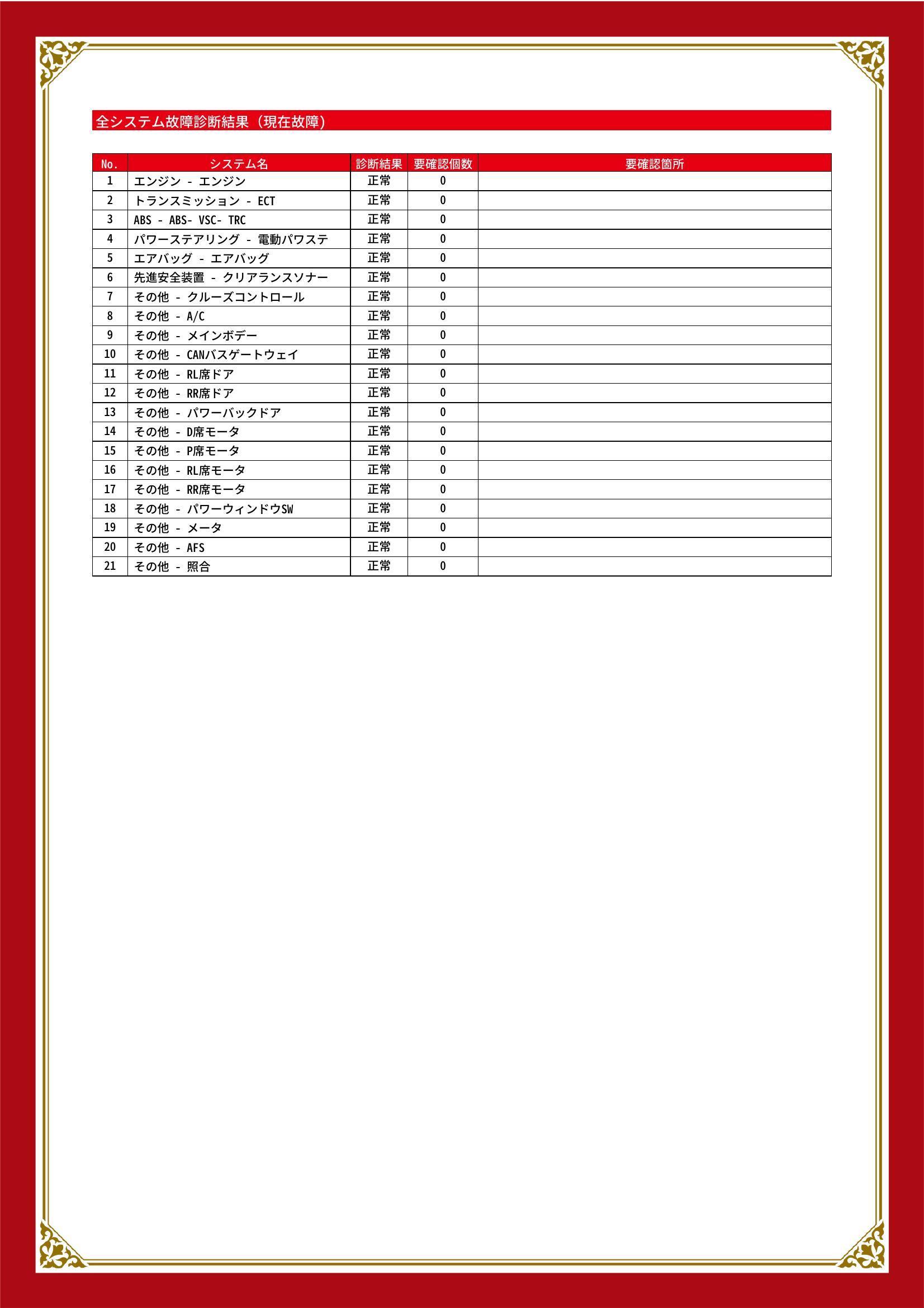 | 保証項目 | 3ヶ月・3000km以内ならエンジン、トランスミッション、ハイブリッド、ステアリング、ブレーキの各機構における主要項目を無償修理(または交換)いたします。 |