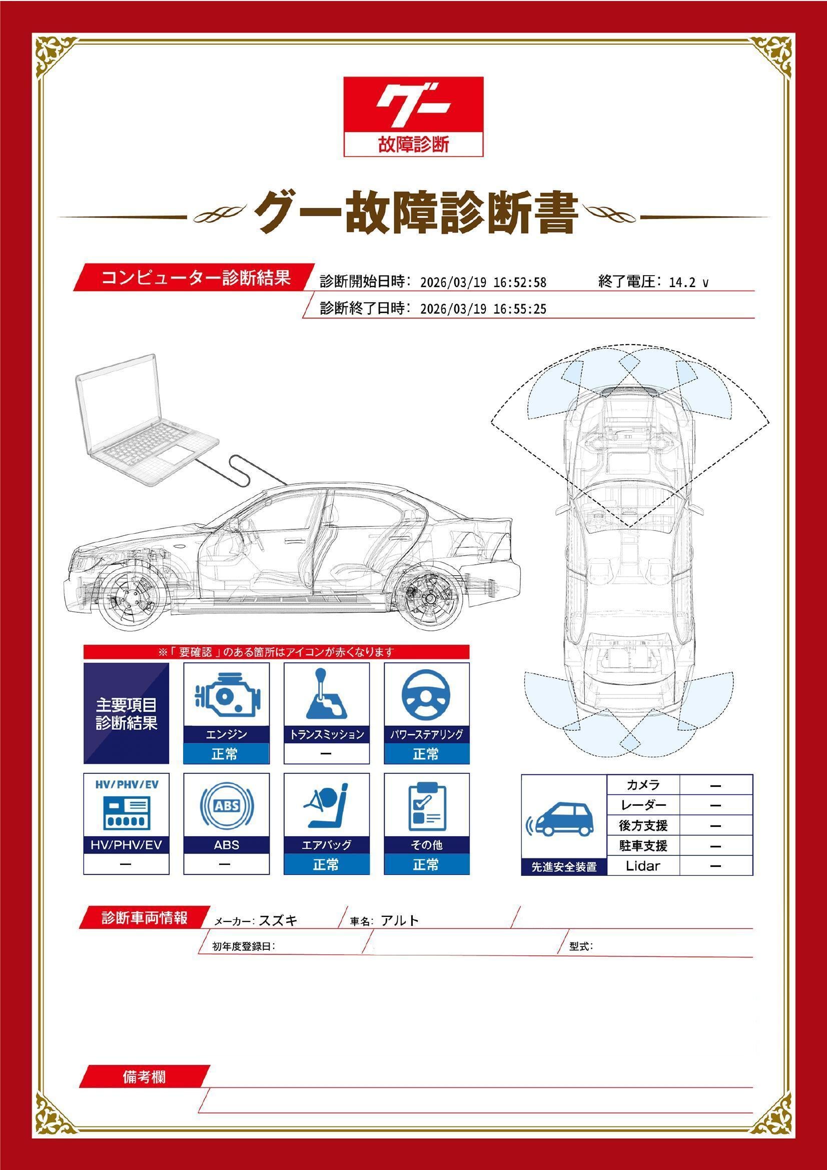 | 保証項目 | 3ヶ月・3000km以内ならエンジン、トランスミッション、ハイブリッド、ステアリング、ブレーキの各機構における主要項目を無償修理(または交換)いたします。 |