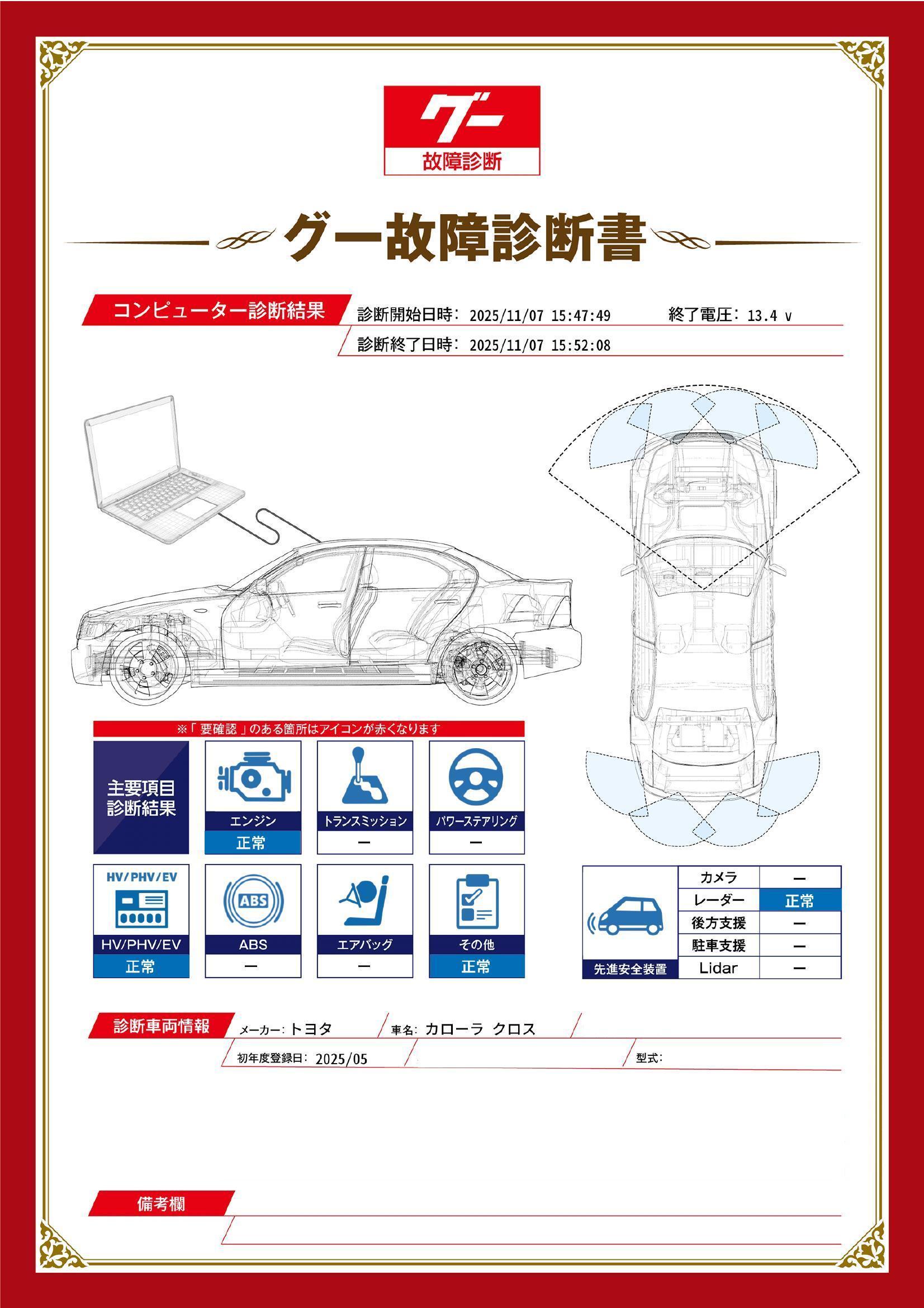 | 保証項目 | 3ヶ月・3000km以内ならエンジン、トランスミッション、ハイブリッド、ステアリング、ブレーキの各機構における主要項目を無償修理(または交換)いたします。 |