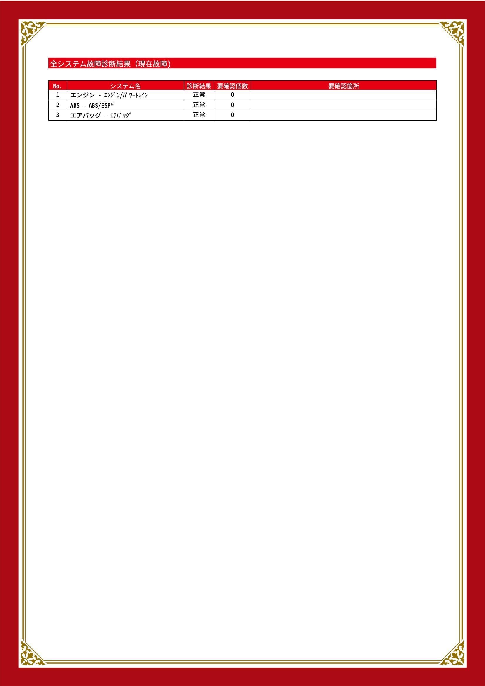 | 保証項目 | 3ヶ月・3000km以内ならエンジン、トランスミッション、ハイブリッド、ステアリング、ブレーキの各機構における主要項目を無償修理(または交換)いたします。 |