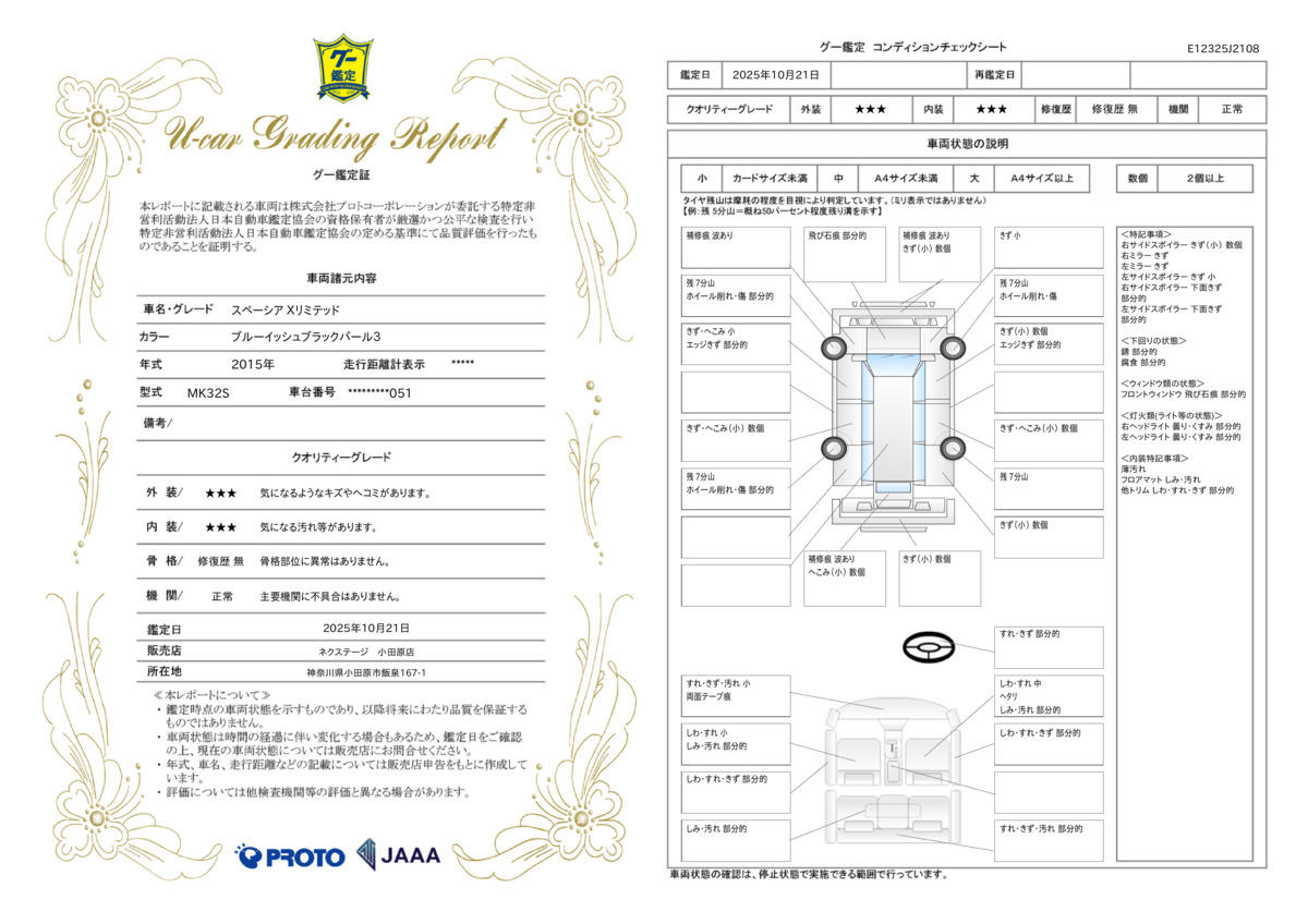 | 保証項目 | 3ヶ月・3000km以内ならエンジン、トランスミッション、ハイブリッド、ステアリング、ブレーキの各機構における主要項目を無償修理(または交換)いたします。 |