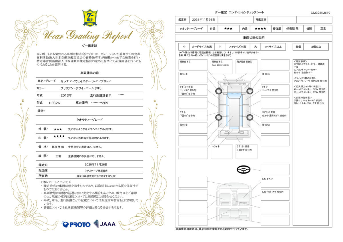 | 保証項目 | 3ヶ月・3000km以内ならエンジン、トランスミッション、ハイブリッド、ステアリング、ブレーキの各機構における主要項目を無償修理(または交換)いたします。 |