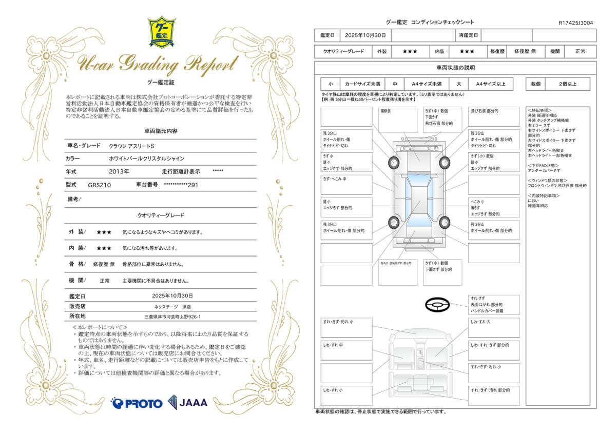 | 保証項目 | 3ヶ月・3000km以内ならエンジン、トランスミッション、ハイブリッド、ステアリング、ブレーキの各機構における主要項目を無償修理(または交換)いたします。 |