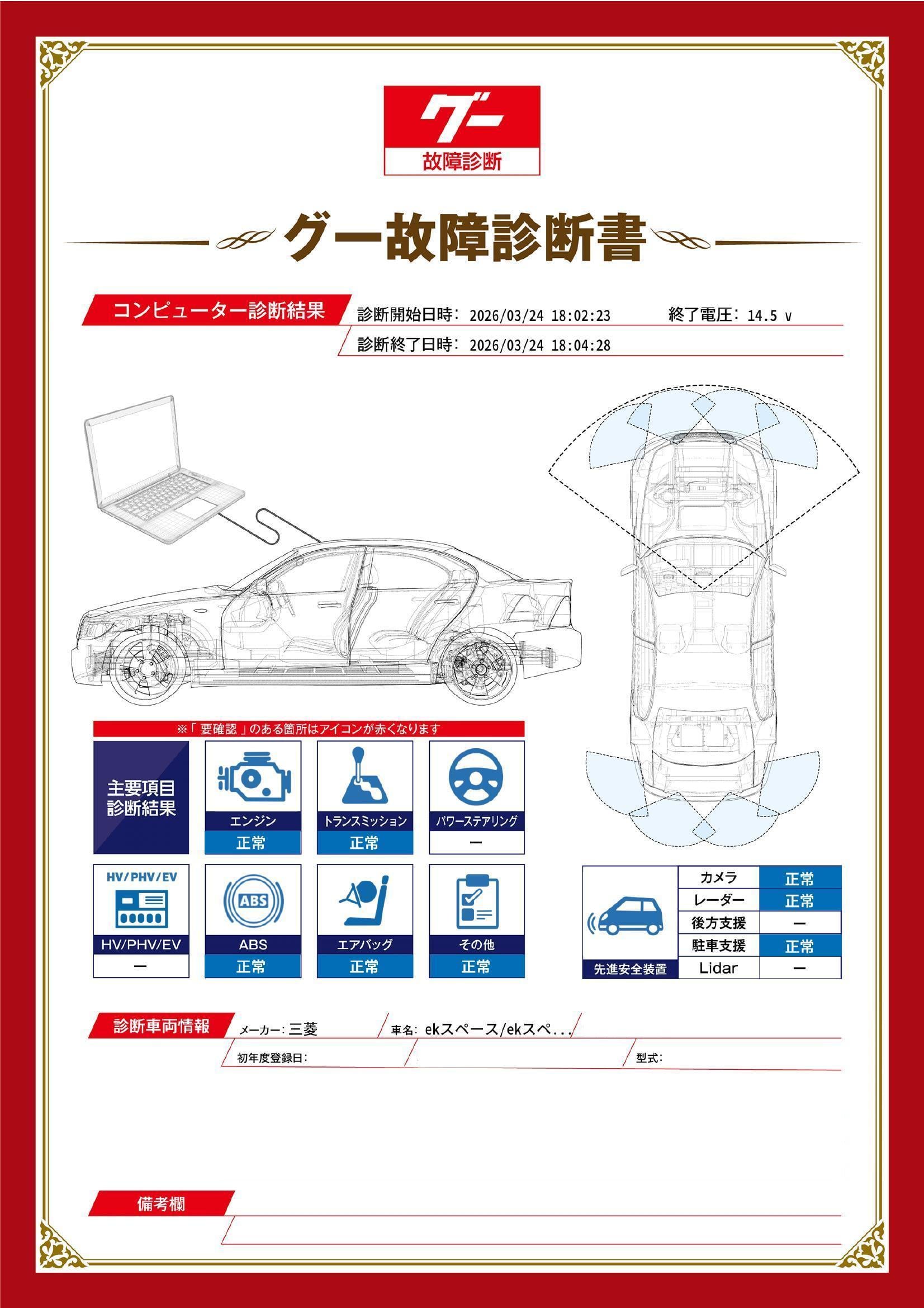 | 保証項目 | 3ヶ月・3000km以内ならエンジン、トランスミッション、ハイブリッド、ステアリング、ブレーキの各機構における主要項目を無償修理(または交換)いたします。 |