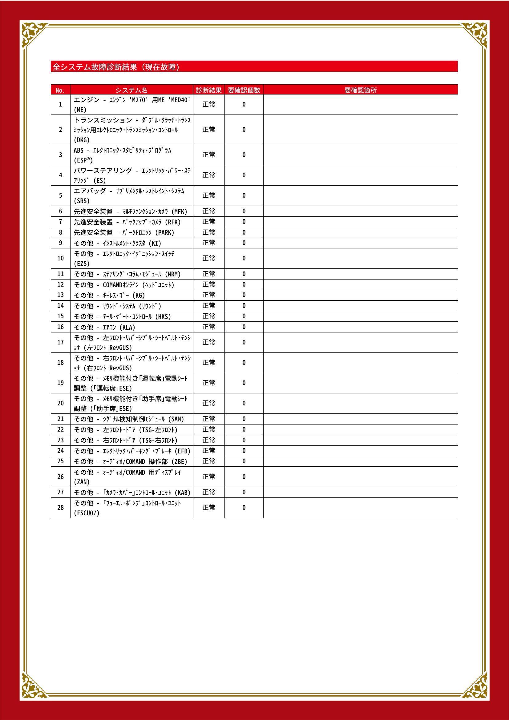 保証項目 | 1ヶ月以内なら走行距離無制限にてエンジン、トランスミッション、ハイブリッド、ステアリング、ブレーキの各機構における主要項目を無償修理(または交換)いたします。 |