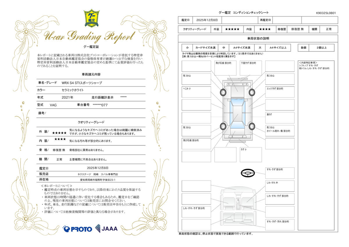 弊社では、全車『修復歴なし』のお車のみ取り扱っております。専任バイヤーによる厳選した仕入れの後、入庫後の車両チェックを行い、ネクステージが認定した高品質な中古車をご提供しております。 21