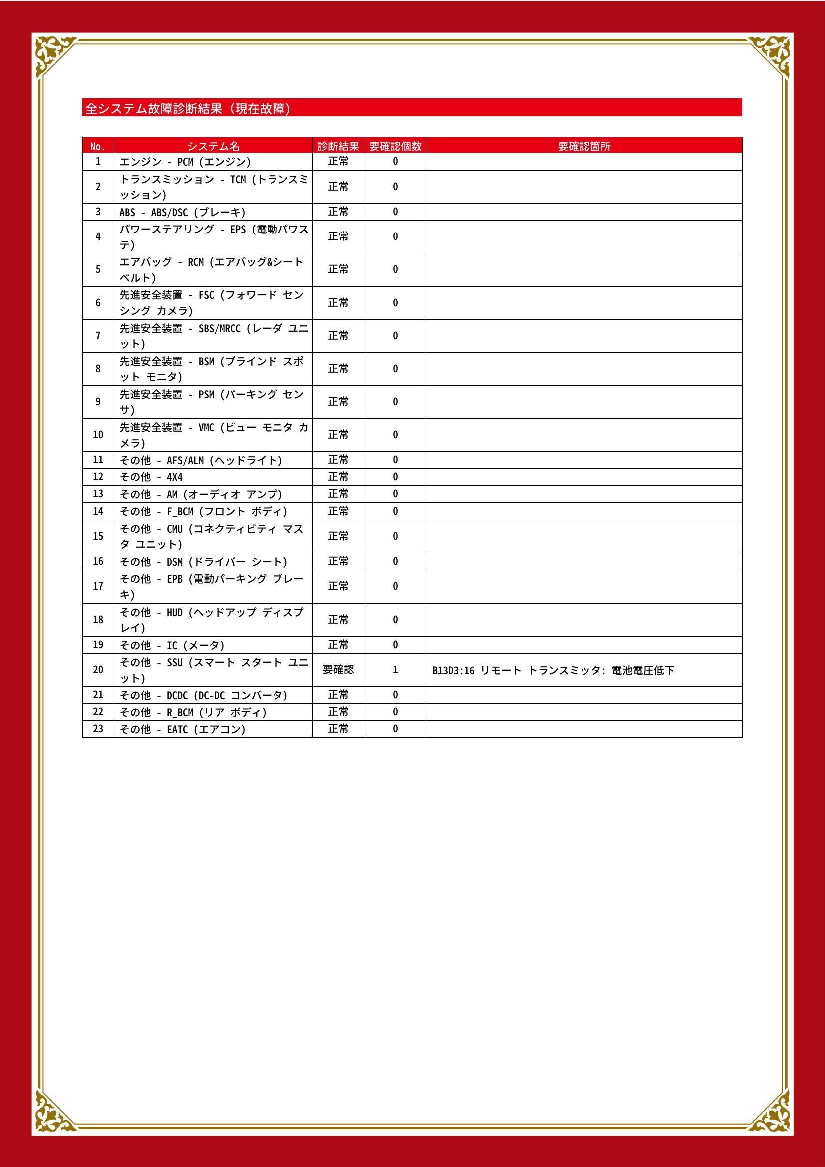| 保証項目 | その他、スタンダード・プラチナ保証をご用意。【スタンダード・プラチナ保証】では対象項目が業界最高水準の400部位以上!消耗品以外は保証にてご対応出来ます。詳細は店舗へお問い合わせください! |
