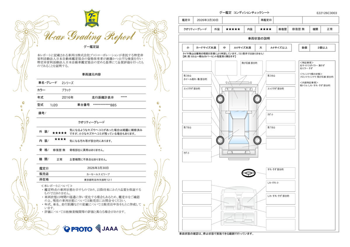 このお車は第三者機関(JAAA)が鑑定を行い、その結果を鑑定証として発行しております。