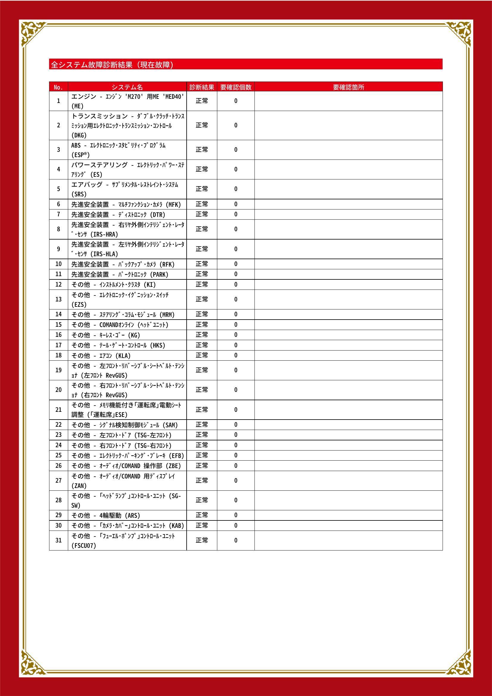 計50項目 エンジン機構:25カ所 ブレーキ機構:6カ所 動力伝達機構:16カ所 ステアリング機構:3カ所 |
