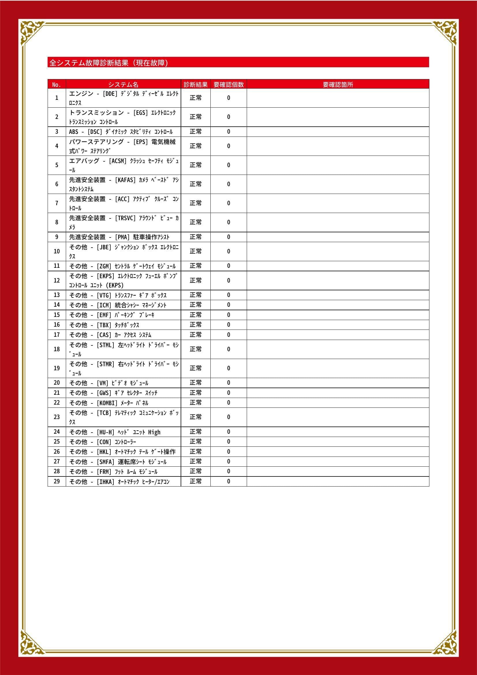 | 保証項目 | 1ヶ月以内なら走行距離無制限にてエンジン、トランスミッション、ハイブリッド、ステアリング、ブレーキの各機構における主要項目を無償修理(または交換)いたします。 |