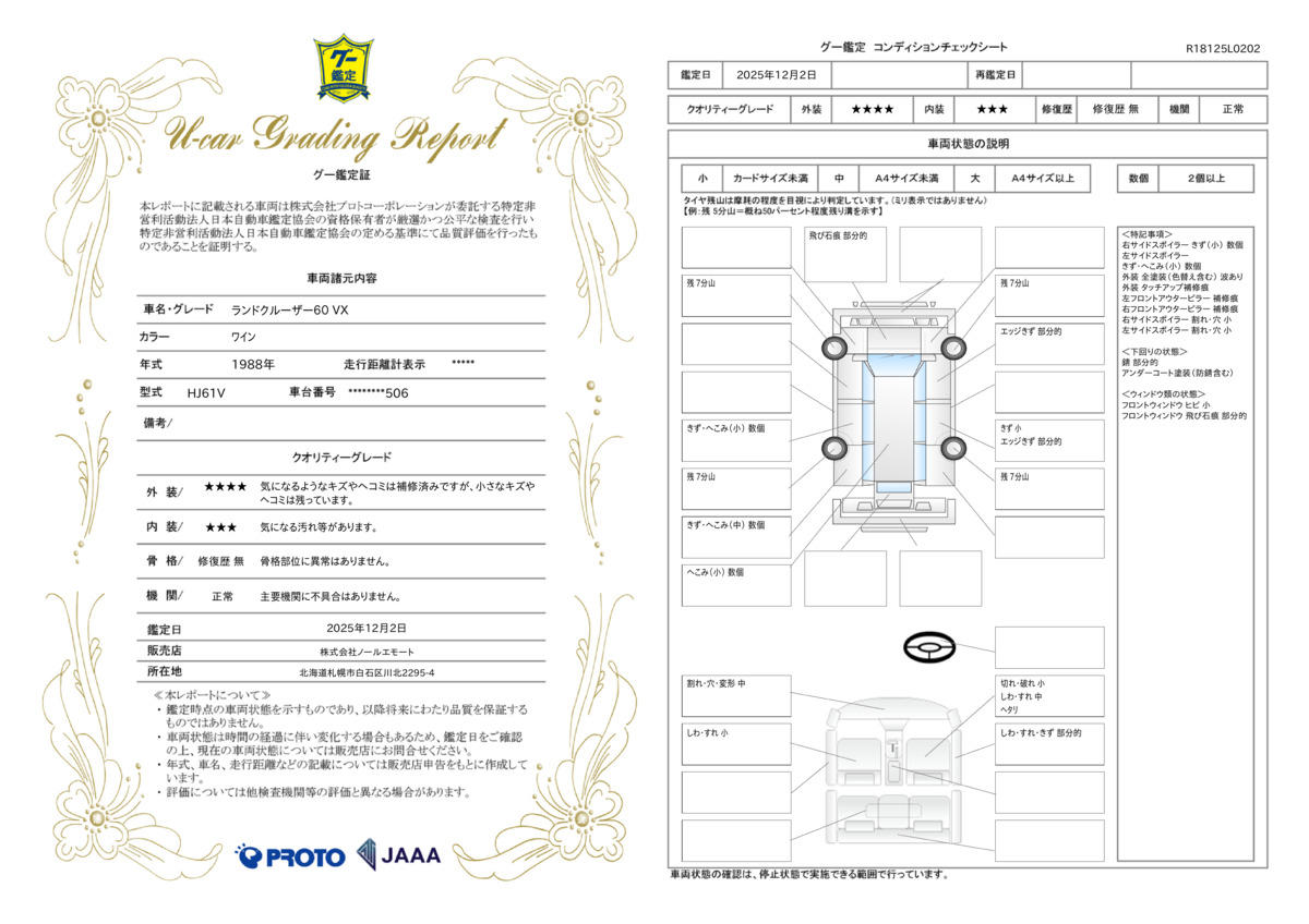 | 保証項目 | ご購入納車後に2か月又は2000キロ走行どちらかの条件が達するまで、保証が適用されます。遠方のお客様も受けれますので、ご安心下さいませ。(弊社規定に基づく保証内容になります) |