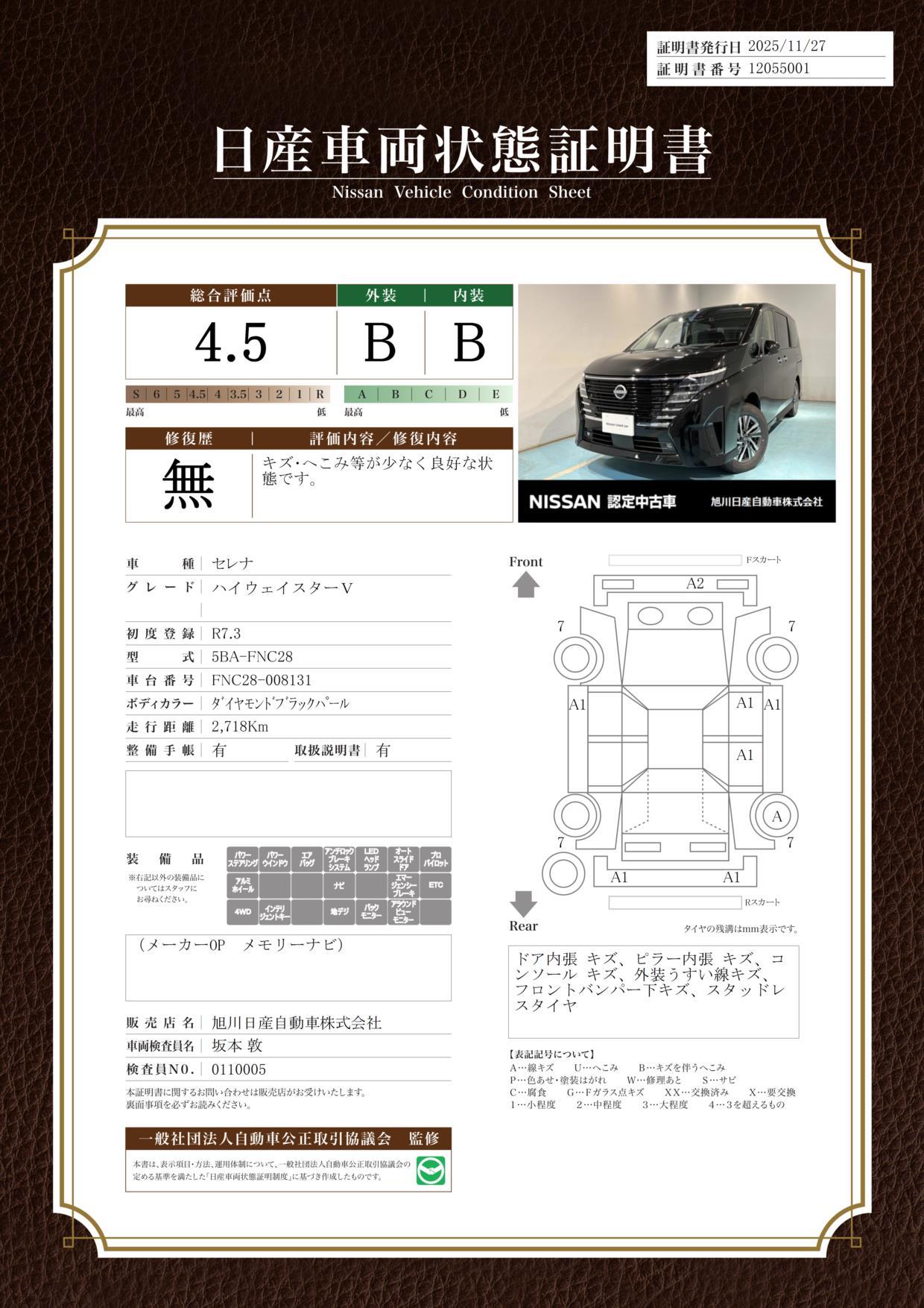 1年間走行距離無制限の日産「ワイド保証(無償)」付。走る・曲がる・止まるの基本部位をしっかり保証。万一のトラブルには、全国2,300の工場がサポート。