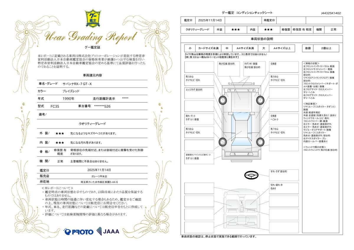 中古車の状態は、専門家でなければなかなか分かりにくいものです。外観は綺麗に見えても内装や隠れた部分、修復歴の有無などほとんど分かりません。お客様に安心してお車を選んで頂く為に、当社の展示車は全て第三者機関の日本自動車鑑定協会の鑑定師が中古車を鑑定。プロが一台一台チェックします。