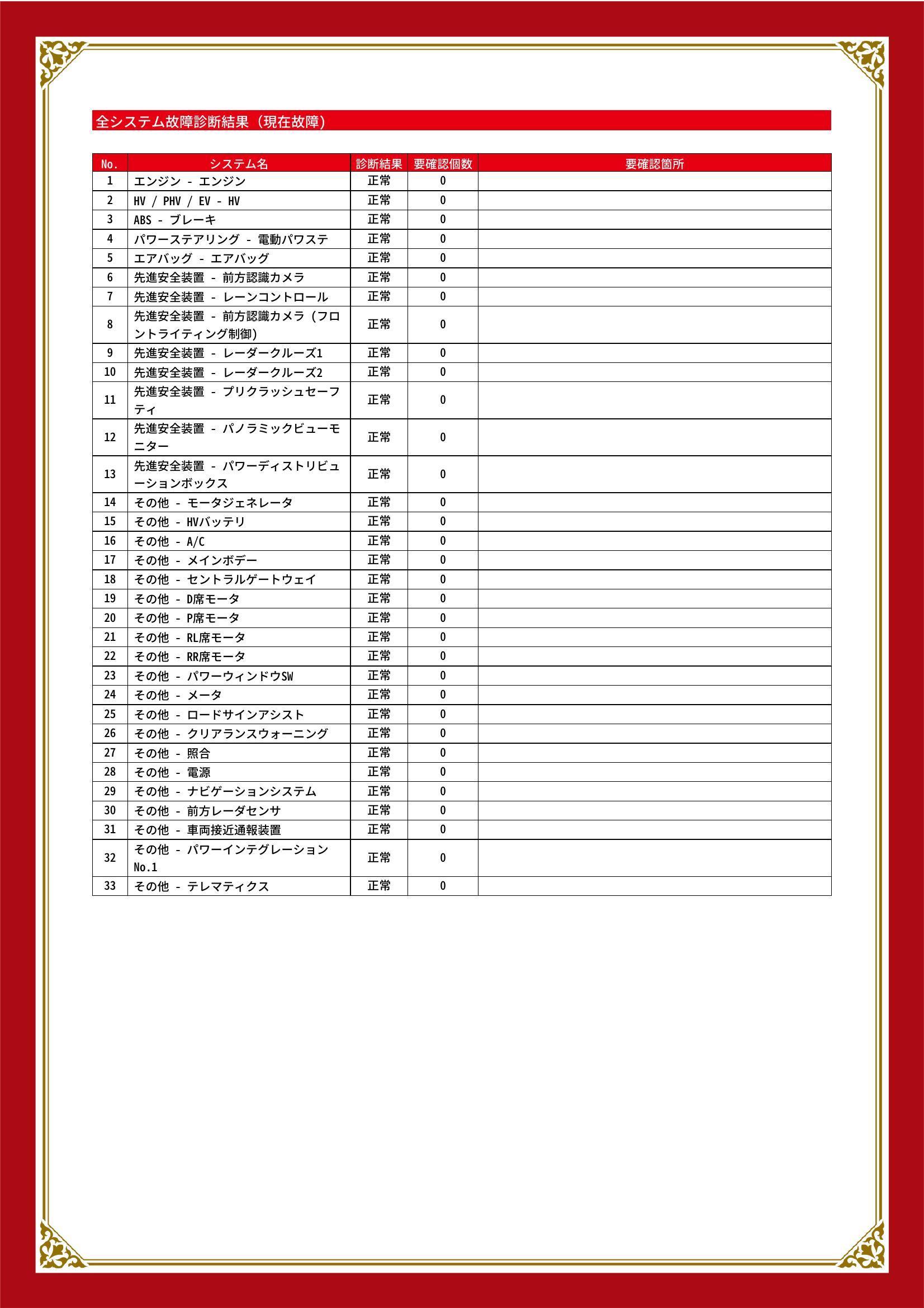 | 保証項目 | 3ヶ月・3000km以内ならエンジン、トランスミッション、ハイブリッド、ステアリング、ブレーキの各機構における主要項目を無償修理(または交換)いたします。 |