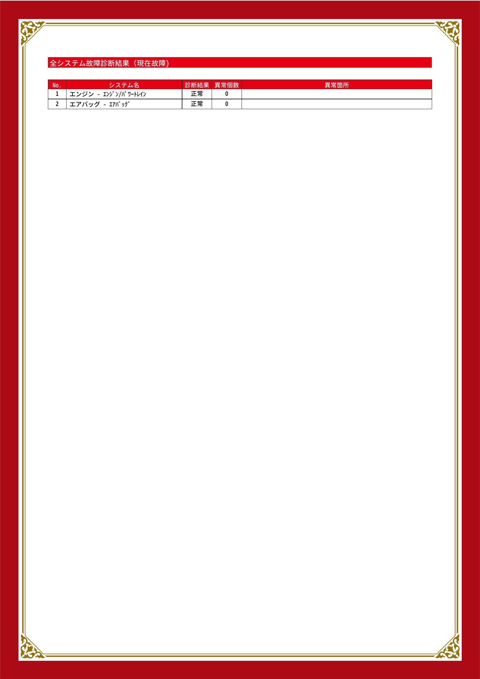 | 保証項目 | 3ヶ月・3000km以内ならエンジン、トランスミッション、ハイブリッド、ステアリング、ブレーキの各機構における主要項目を無償修理(または交換)いたします。 |