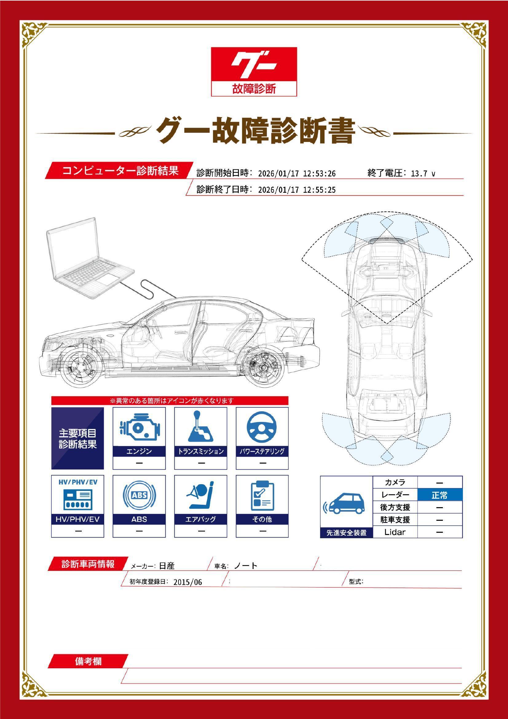 | 保証項目 | 3ヶ月・3000km以内ならエンジン、トランスミッション、ハイブリッド、ステアリング、ブレーキの各機構における主要項目を無償修理(または交換)いたします。 |