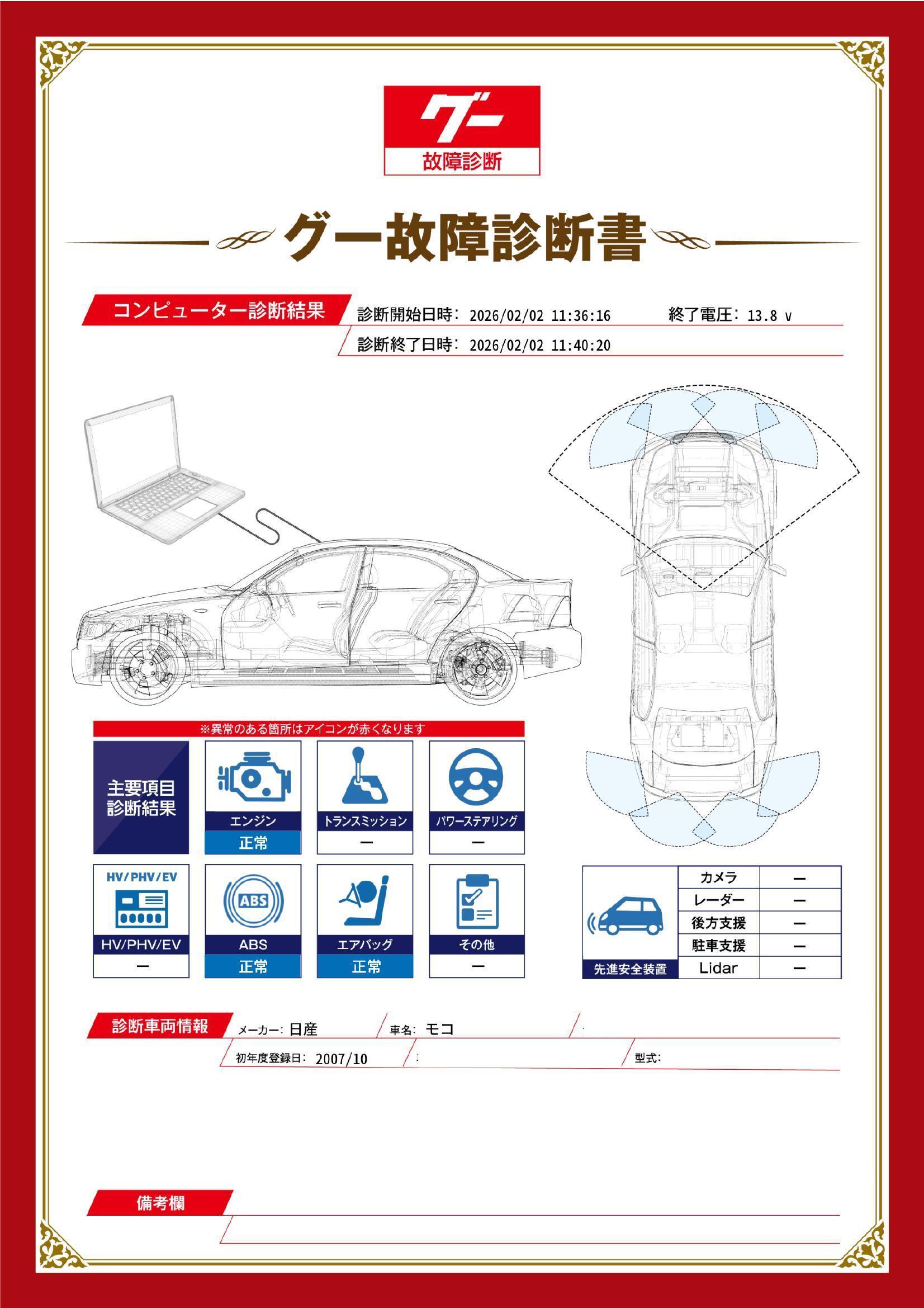 保証項目 3ヶ月・3000km以内ならエンジン、トランスミッション、ハイブリッド、ステアリング、ブレーキの各機構における主要項目を無償修理(または交換)いたします。