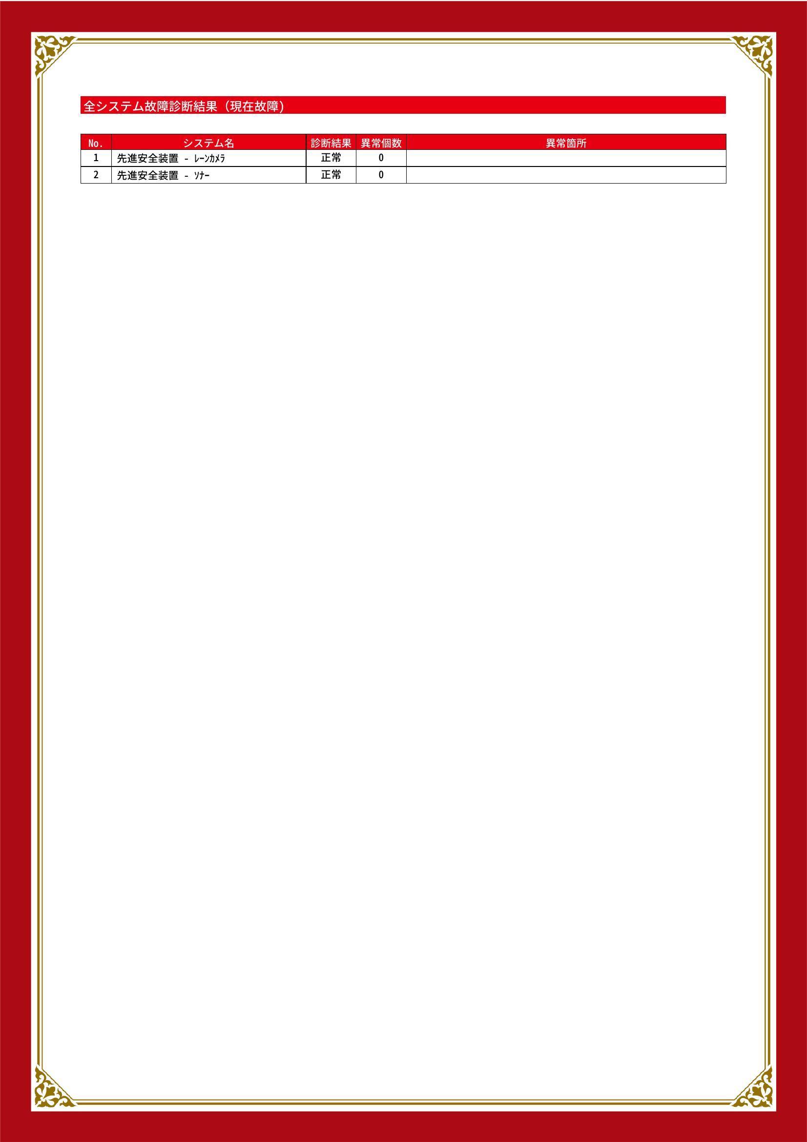 | 保証項目 | 3ヶ月・3000km以内ならエンジン、トランスミッション、ハイブリッド、ステアリング、ブレーキの各機構における主要項目を無償修理(または交換)いたします。 |