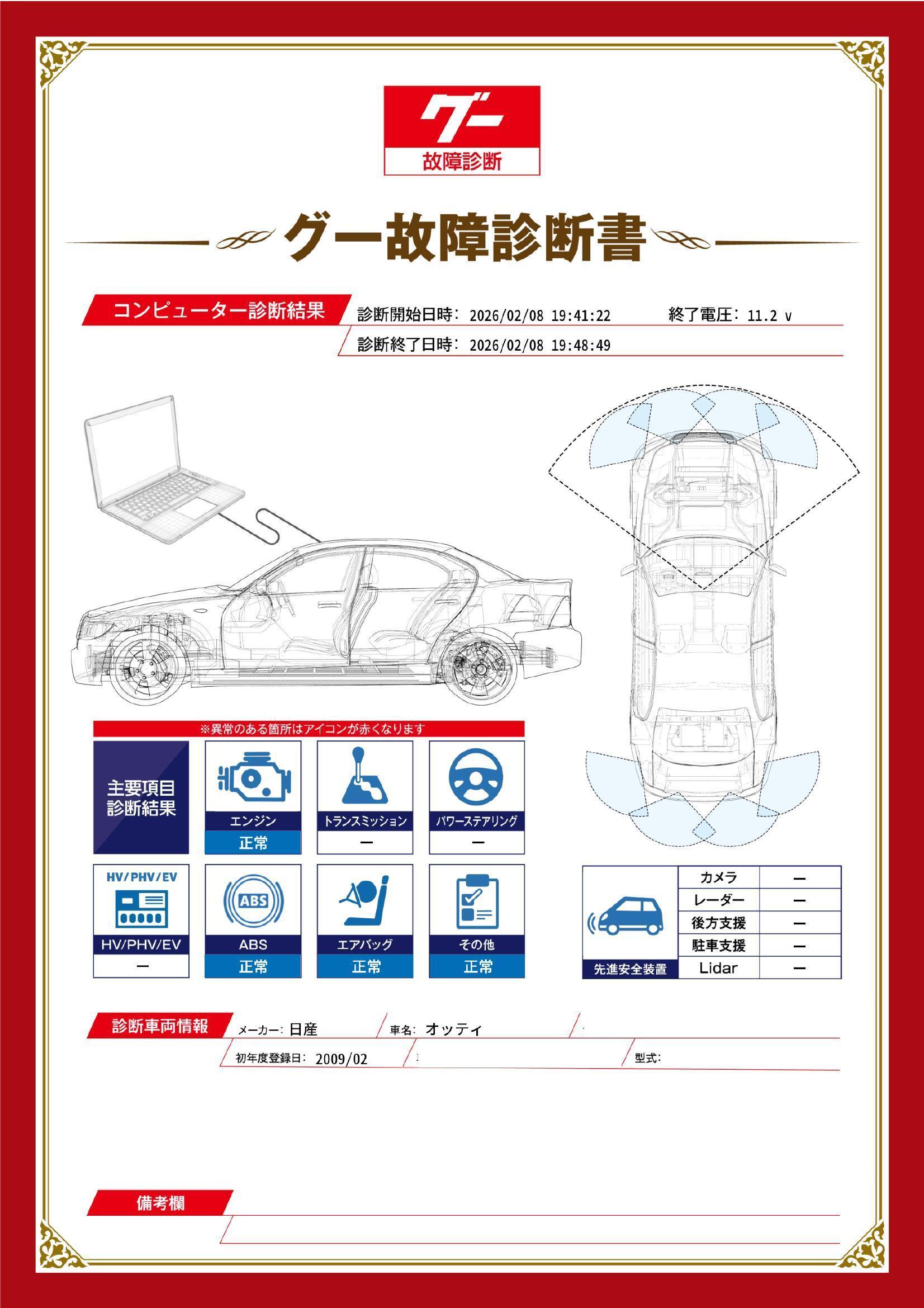 | 保証項目 | 3ヶ月・3000km以内ならエンジン、トランスミッション、ハイブリッド、ステアリング、ブレーキの各機構における主要項目を無償修理(または交換)いたします。 |